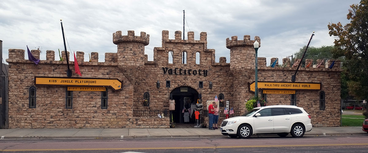 But that is only the beginning of the weirdness in Mitchell. Right across the street is “Valticoty”, a gift shop in a castle, with a “kids jungle playground” and a “walk-thru ancient bible world.” When we were perplexed by the name, the owner, apparently an eastern-European fundamentalist, told us it was from the initial syllables of the names of the Three Wisemen. We moved along quickly.