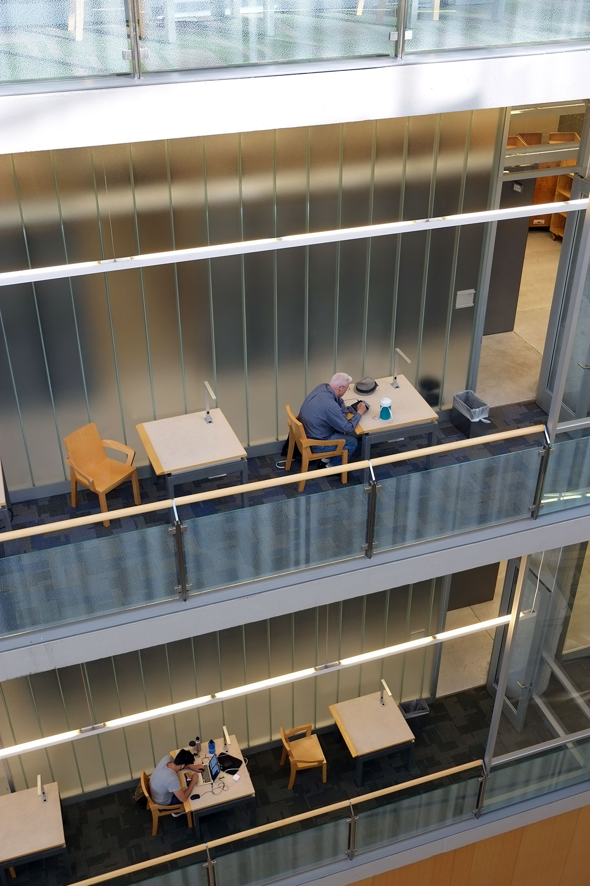 individual study carrels on balconies hanging into the atrium