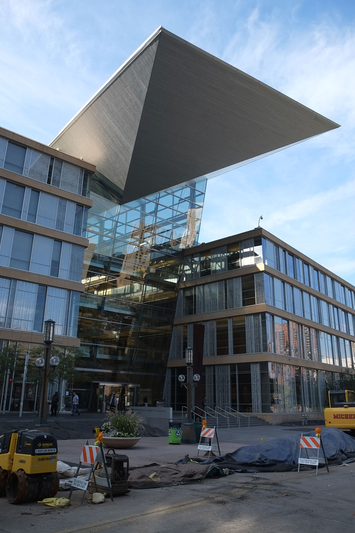 the downtown library, by Cesar Pelli. The linear atrium has clerestory windows which bounce light in off the big wedge floating above.