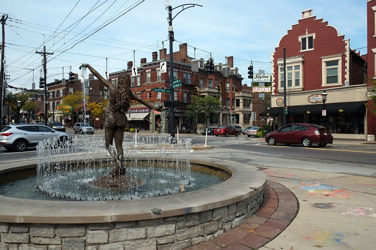 But what I continue to find most engaging in Cincinnati are the neighborhoods. After the flatness and griddedness of the plains, being in a city where the neighborhoods, transportation routes and whole order of the city are determined by the topography (hills and water) is really engaging. There was the Hyde Park district, where a very nice urban space is surrounded by mixed-use buildings, all within walking distance of Brian and Olga’s.