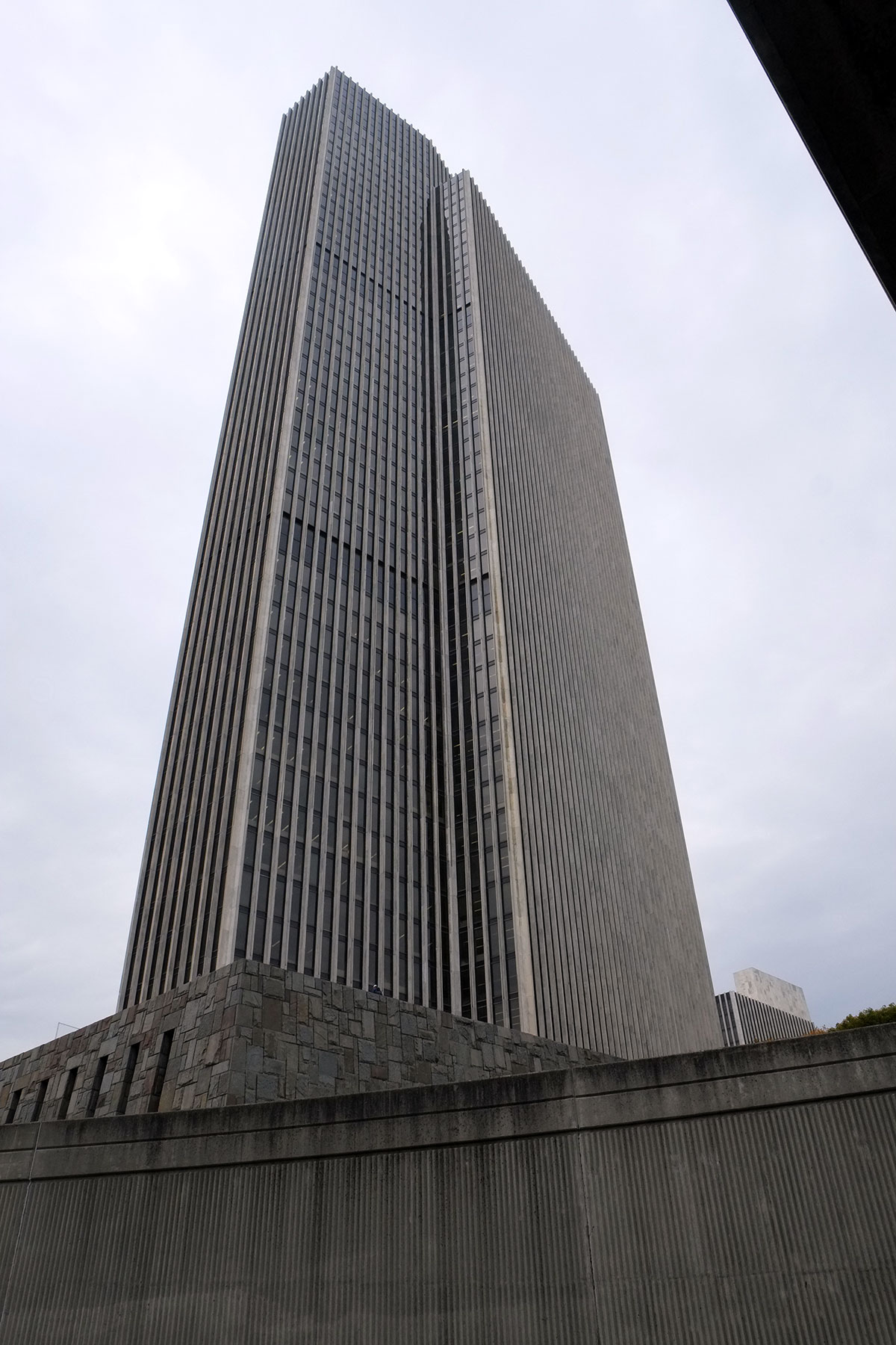 The buildings range from the banal to the truly awful. Wallace K. Harrison was Nelson Rockefeller’s favorite architect, their association going back at least to the design of the UN (where Harrison first began copying Corbu). He was of the grandiose modernist school (which is often detectable through the excessive use of marble), and in New York he was partially responsible for Lincoln Center. The buildings fit into the simple parti of the plaza design – a museum facing the Capitol at the end of the axis, four smallish towers on one side facing a large tower and the “Egg” on theater, with a couple of bookends near the Capitol.
