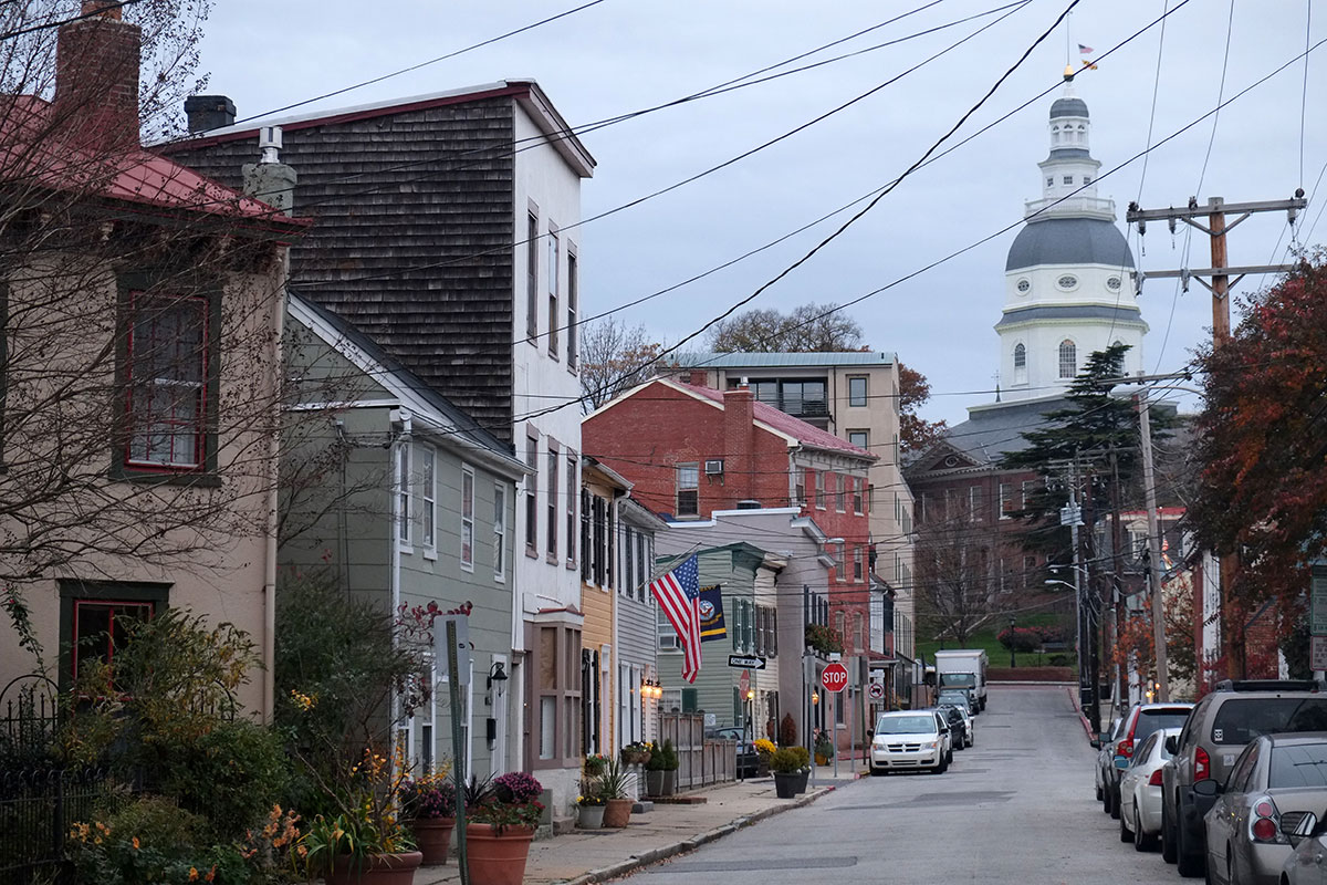 A beautiful, well-preserved, 18th-century state house, surrounded by a district which is still largely 18th- and 19th-century.  How can this be?  Where are all the soul-less boxes of bureaucrats?  Baltimore.  Maryland had the good sense to realize there’s no real reason why all the functions of state government have to be in the same neighborhood, and those large boxes were placed in a large city which was better able to accommodate their scale, both architecturally, and in terms of how many employees would have to work there.