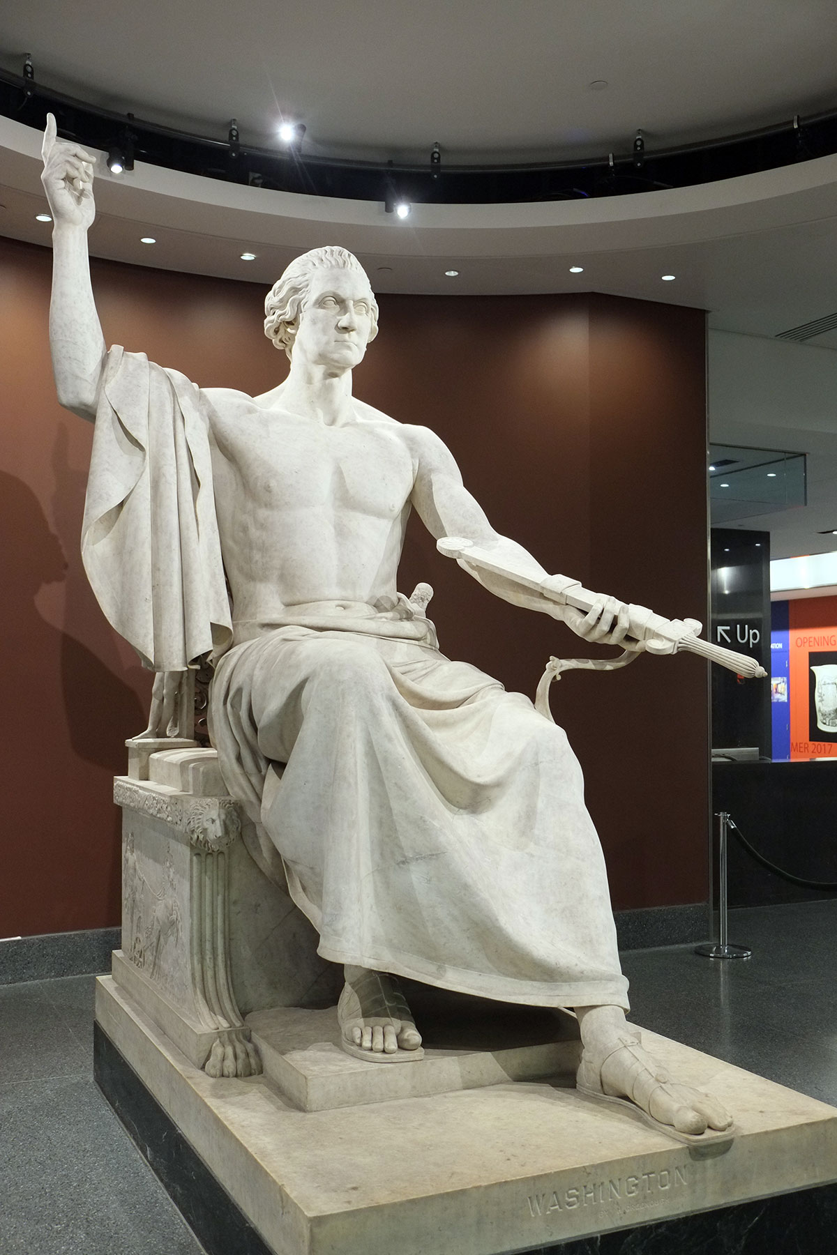 The American History Museum was much better than I remembered;  I think the new approaches to exhibit design of recent decades have been spectacular.  We checked off some iconic pieces, such as the Star Spangled Banner, the display of which unfortunately shows some of the same grandiosity and obsessive fetishism of objects which ruined the experience of Mt. Rushmore and the Liberty Bell.  We also caught the greatest of the slightly-nutty representations of a founding father as a Roman republican:
