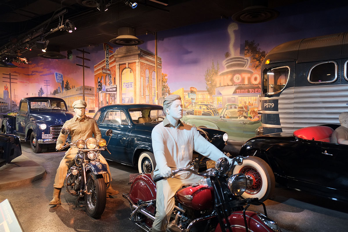 The ability of the installations to show the social, economic, technological and political context of the objects was really sophisticated.  The section on transportation clearly demonstrated the interactions between the changing transportation systems and the economy, making connections that I’d never fully understood (such as why the textile industry was able to shift to the south when it did).  And strangely enough, the section on post-war car culture focussed on Sandy Boulevard in Portland, with this tableau of cruising through Hollywood.  DSCF6243