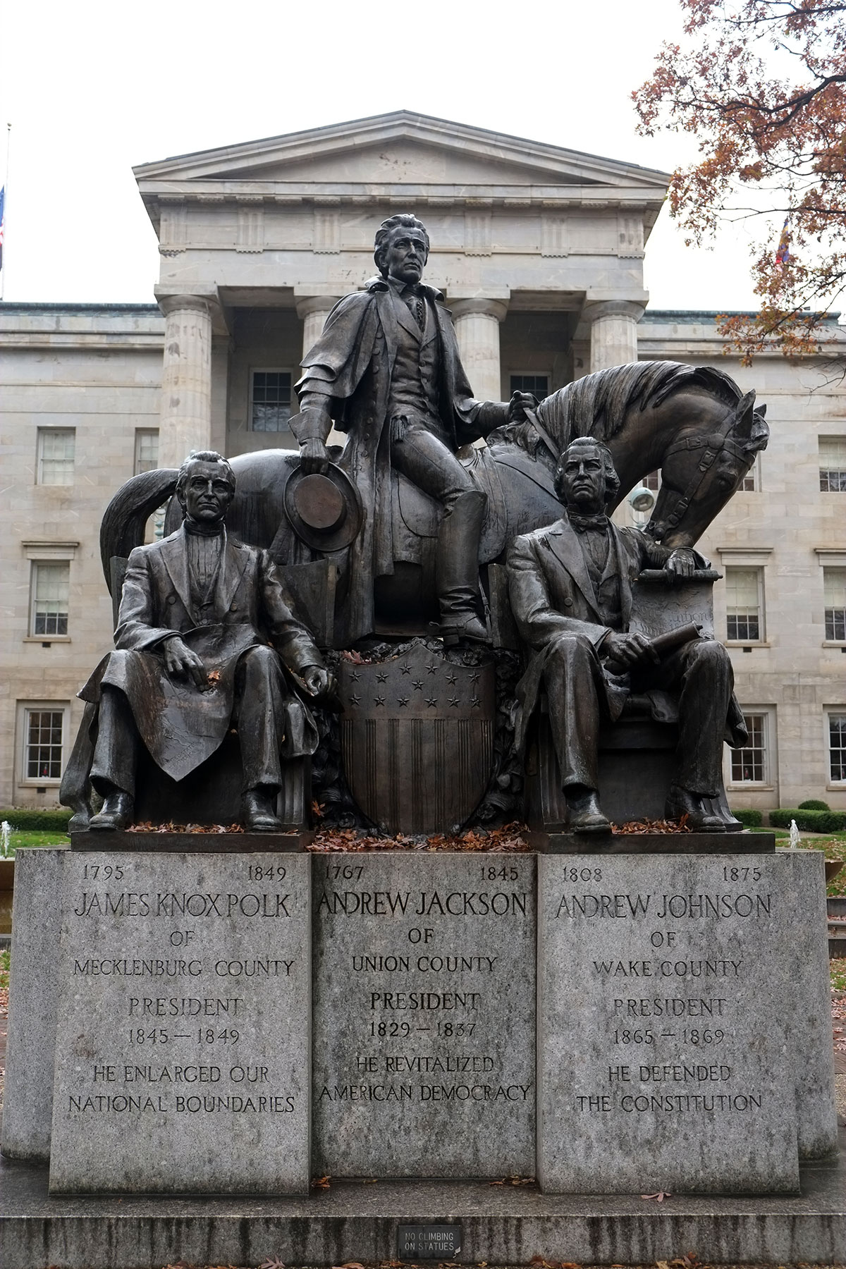 Outside there is a monument for the three presidents who were born in North Carolina. As we walked around the grounds we came across statues of people who are so obscure that we had never heard of them, so we wondered why all three presidents were packed into one monument instead of each getting his own. Perhaps it’s because they feel somewhat ambivalent about Johnson, and didn’t want to honor him too much (and it does look like he’s being nuzzled by Jackson’s horse).