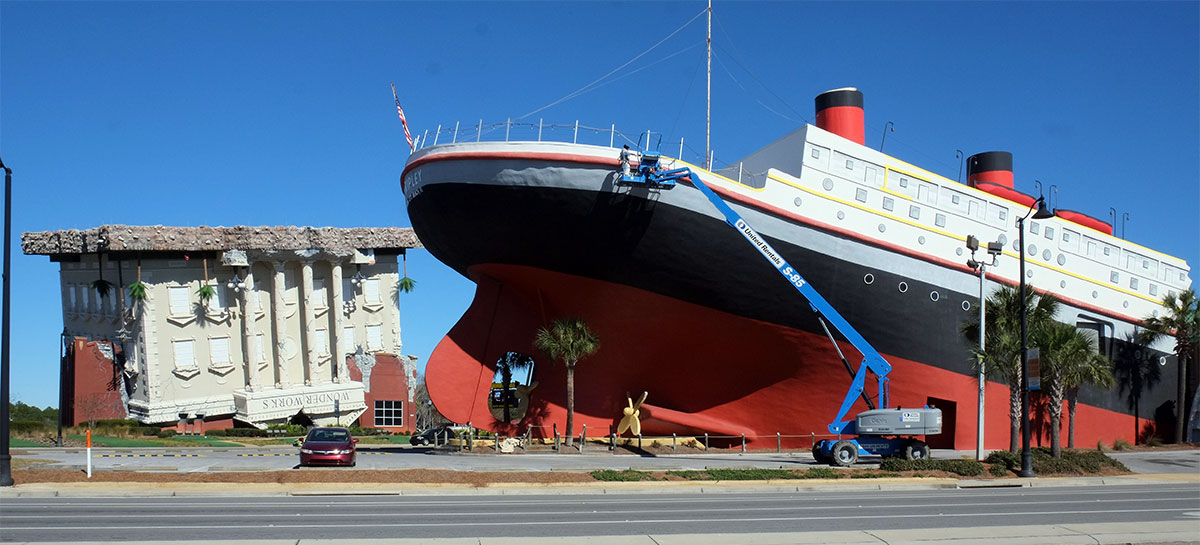 If South Dakota is the center of western kitsch, Florida is the king of the kitsch in the south. There are carloads of tourists looking for distractions and kids to be entertained. Panama City Beach has a main drag with one fantastic apparition after another. There is the sinking ship at the Ripley’s Museum,