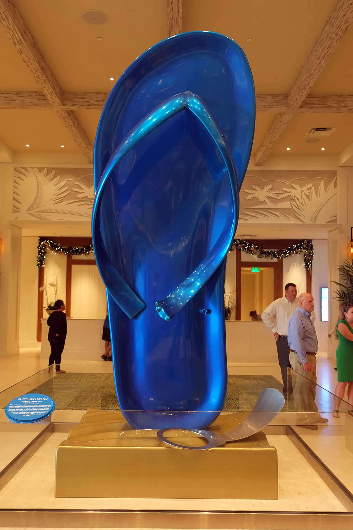 Then there is ironic meta-kitsch. At the Margaritaville Resort hotel in Hollywood, there is this monument to the blown-out flip-flop and pop-top in the lobby. The label beautifully parodies the pretensions of museum labels everywhere, with its reference to POP-top-ART.