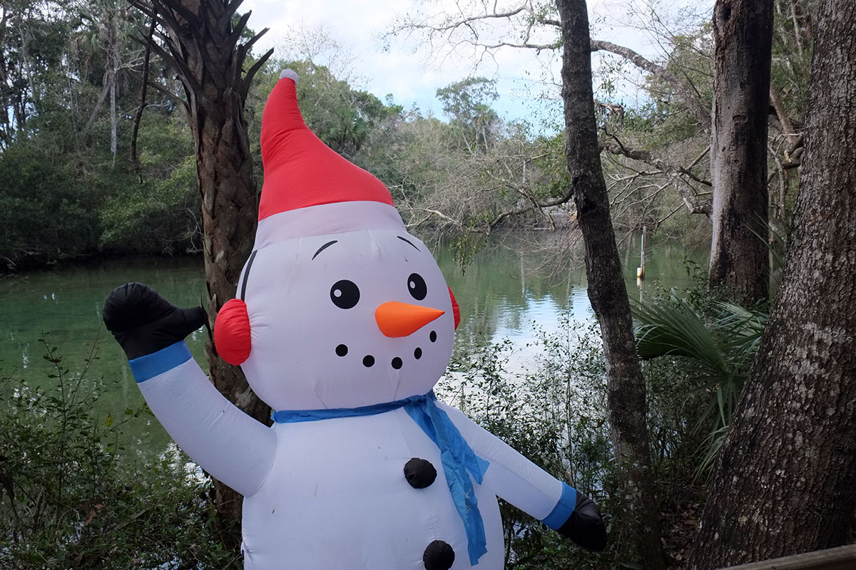 Even non-kitsch locations in Florida can’t resist the allure. At Homosassa Springs, a state park with resident manatees and a wonderful small aviary, there is a snowman on the bayou.