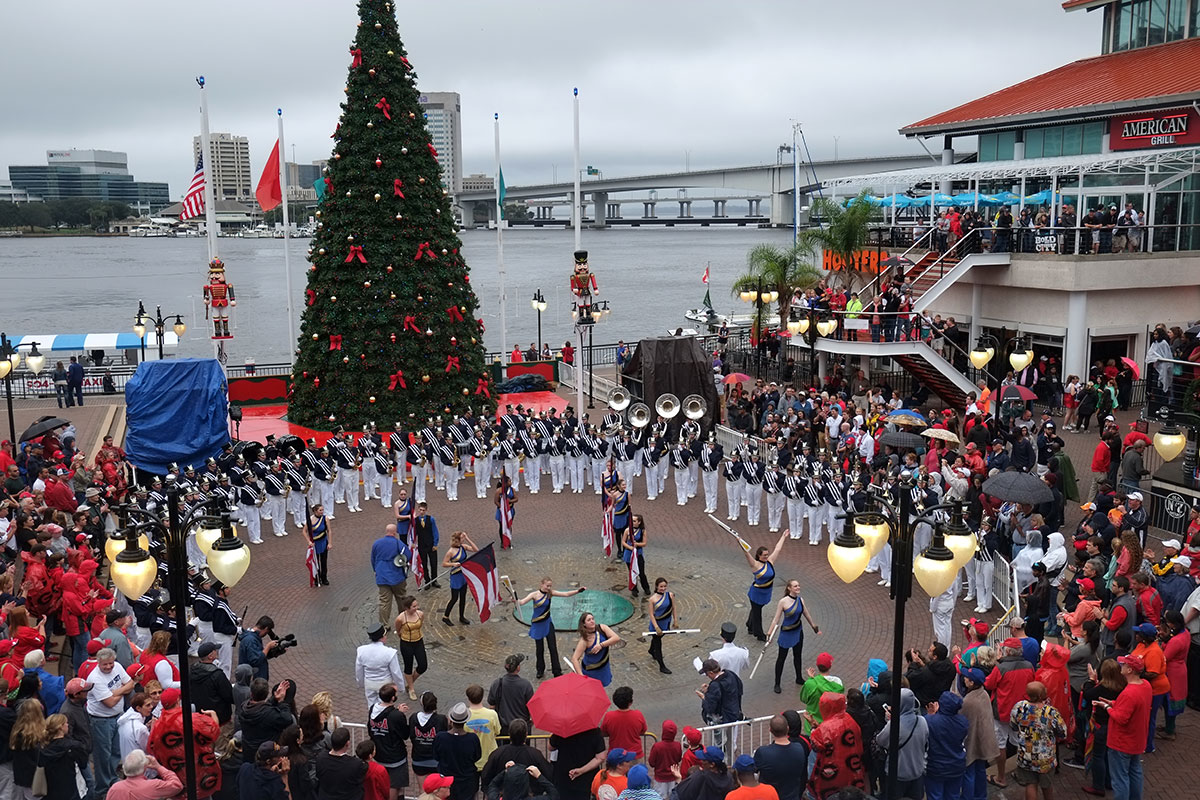 Events can be kitsch too. On a rainy and cold (for Florida) New Years Day, we were wandering around downtown Jacksonville, and stumbled upon a pep rally for the impending bowl game between Georgia and Penn State. We caught the impressive Georgia band and cheerleaders (and discovered that Georgia had long ago co-opted the Battle Hymn of the Republic to be their football fight song – a striking act of musical kitsch on its own), but Greta was mainly impressed by the waves of shivering high school cheerleaders performing in the rain.