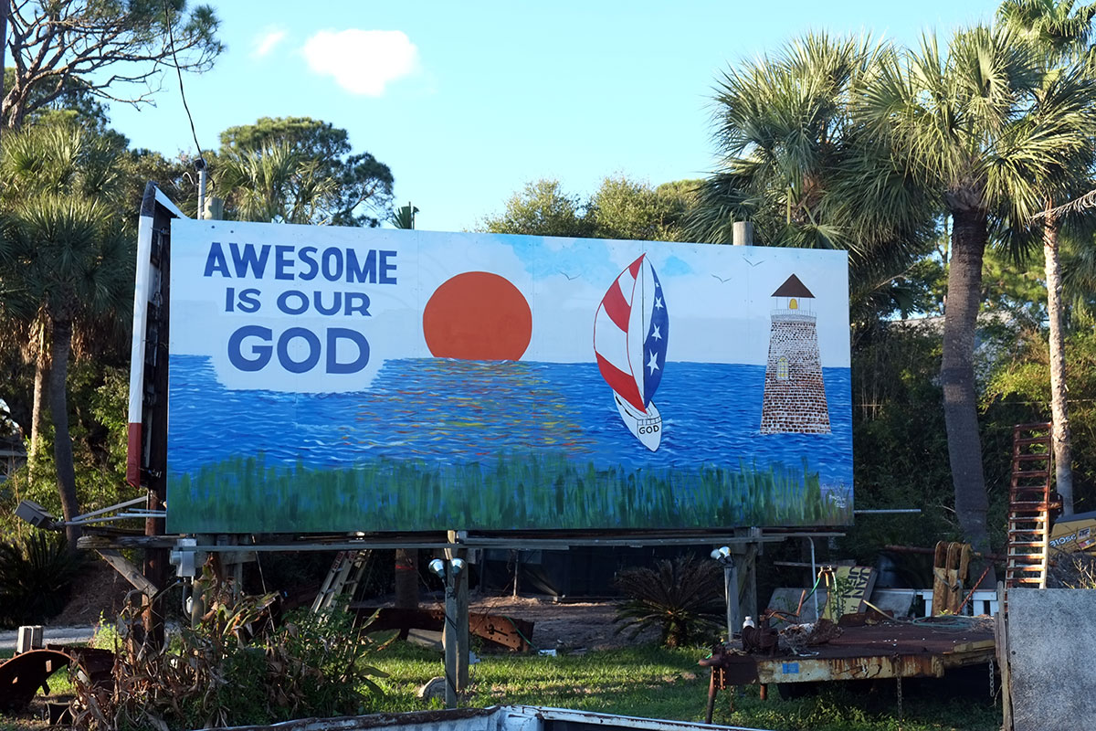 down the road from a religious billboard which could support at least one article in the Journal of Religious Iconography and Semiotics. (Note that this is not the only God+sailboat imagery we spotted in Georgia.)
