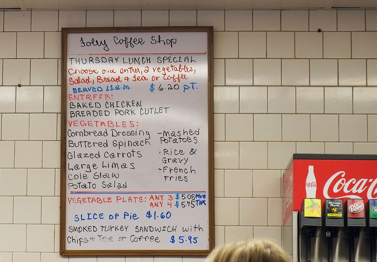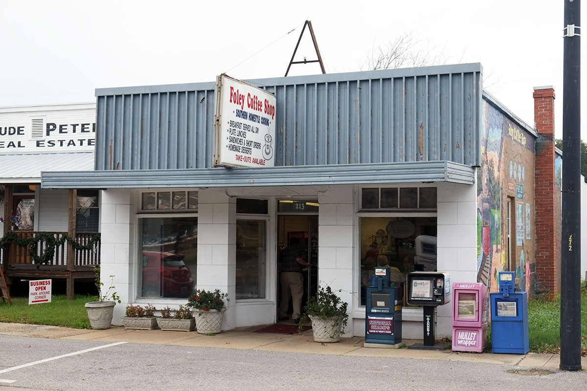 The biggest disappointment on our travels in the South has been the displacement of barbecue joints. Every little town or city you pass is full of chain fast food places, which seem to have squeezed the barbecue out – as Calvin Trillin noted last fall in the New Yorker, the future of barbecue seems to be heading into the cities, where it is appreciated by yuppie connoisseurs. So at lunchtime we turned to the excellent database compiled by the folks at Roadfood.com, which directed us to the Foley Coffee Shop, in the charming small city of Foley, Alabama. Greta isn’t blogging about this as it wasn’t necessarily a culinary awakening, but it was a cultural one.