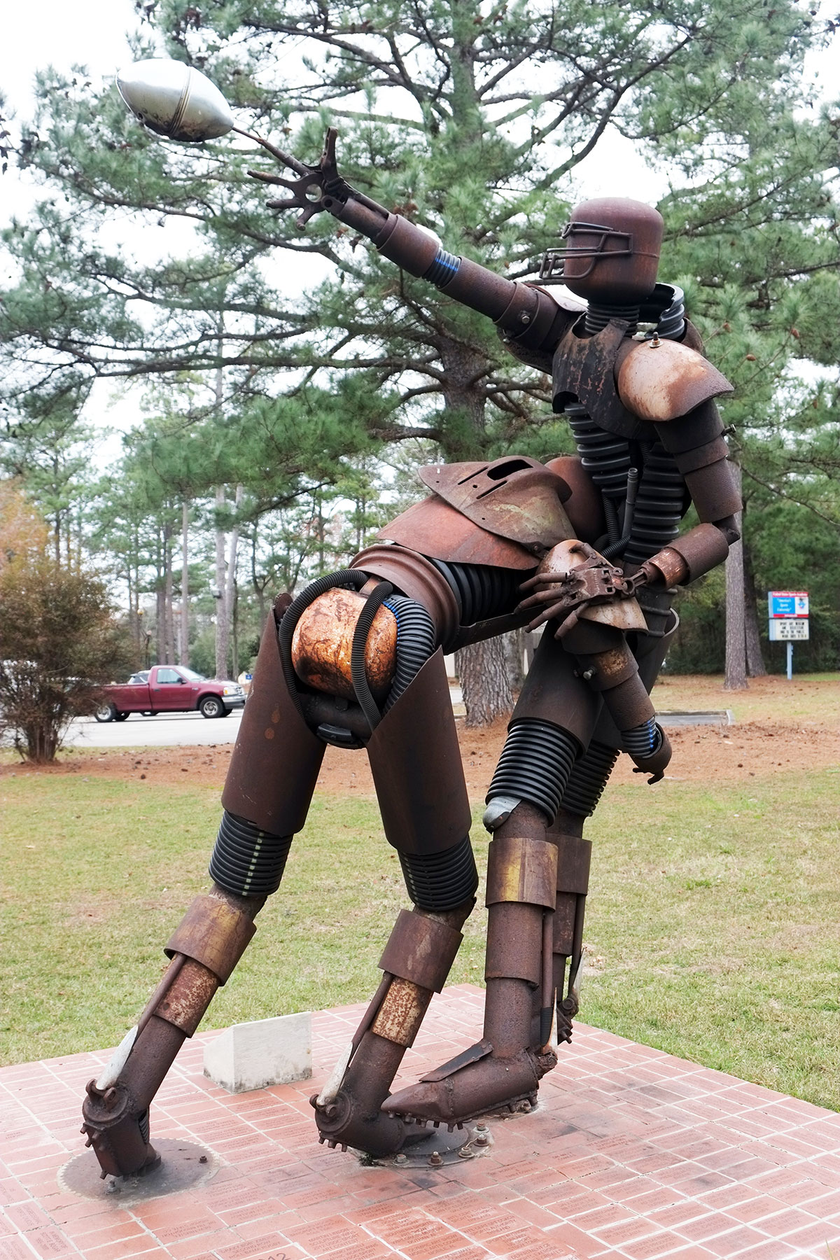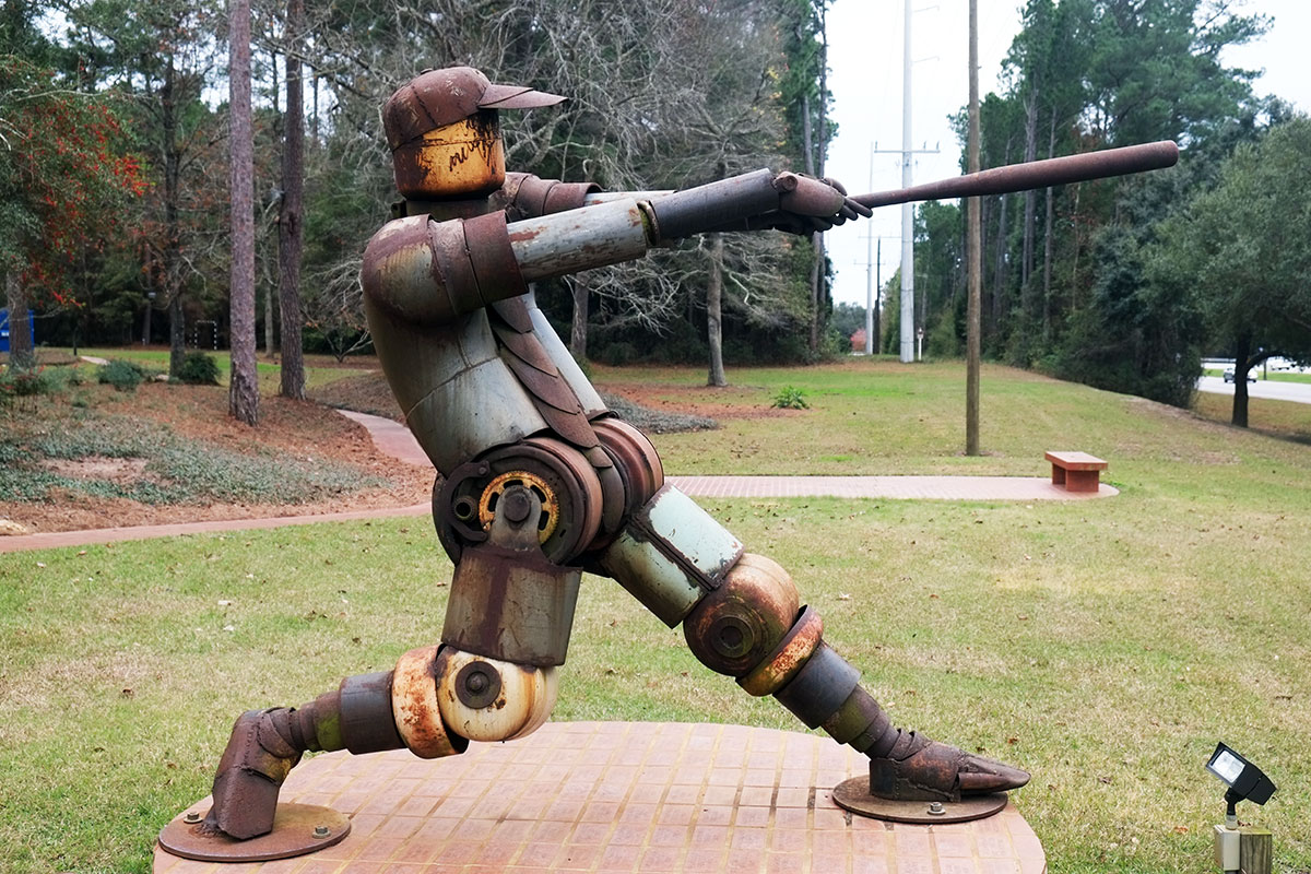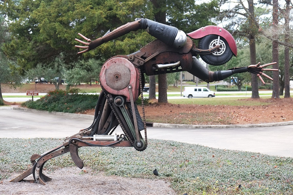 The other great cultural mainstay of Alabama is football, so guided by the map at RoadsideAmerica.com, we stopped at the US Sports Academy in Daphne, to see the sports sculptures made of junk metal by Bruce Larsen. (Unmediated football doesn’t interest us, but representations might.) They are remarkable, using rigid materials to convey a sense of movement, power and tension. Greta liked them because they were so Steampunk.
