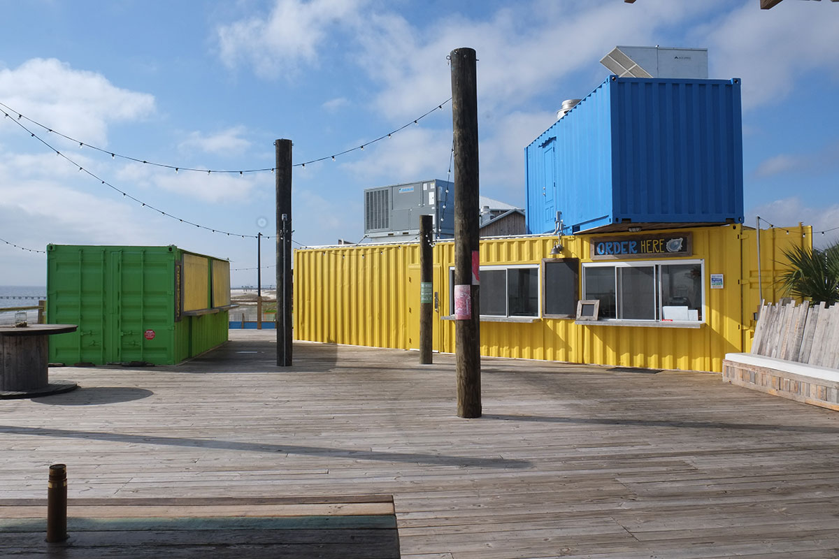New waterfront buildings are raised above the flood level, and include this bar, which is about the only building I’ve ever seen which makes reasonable use of shipping containers.