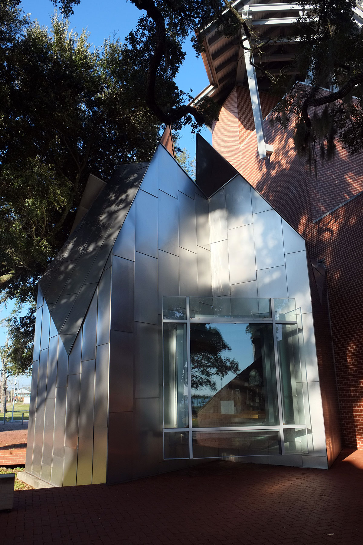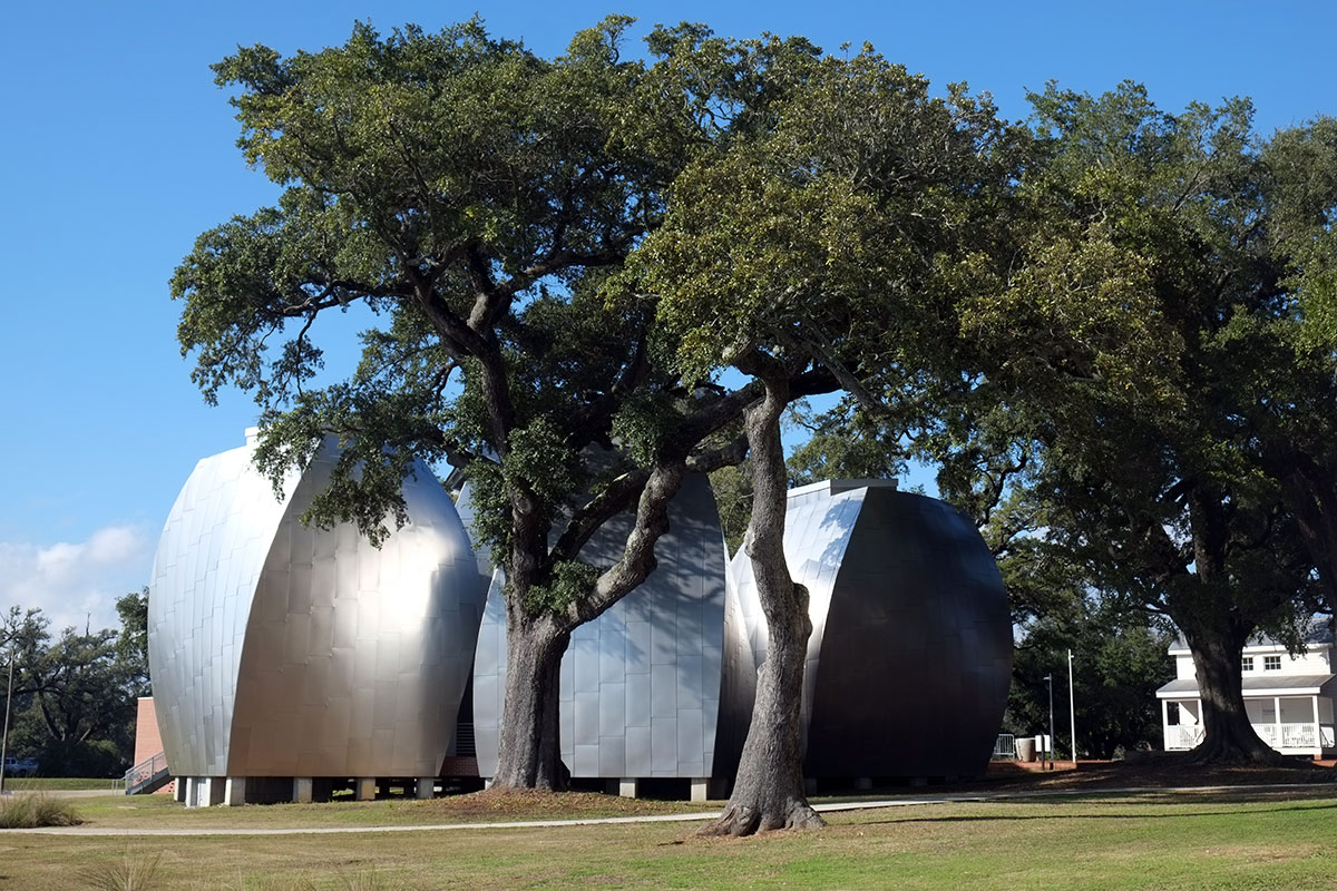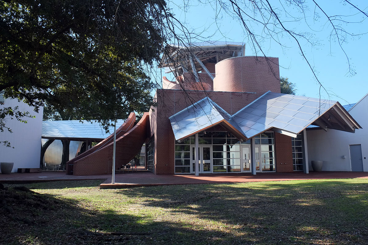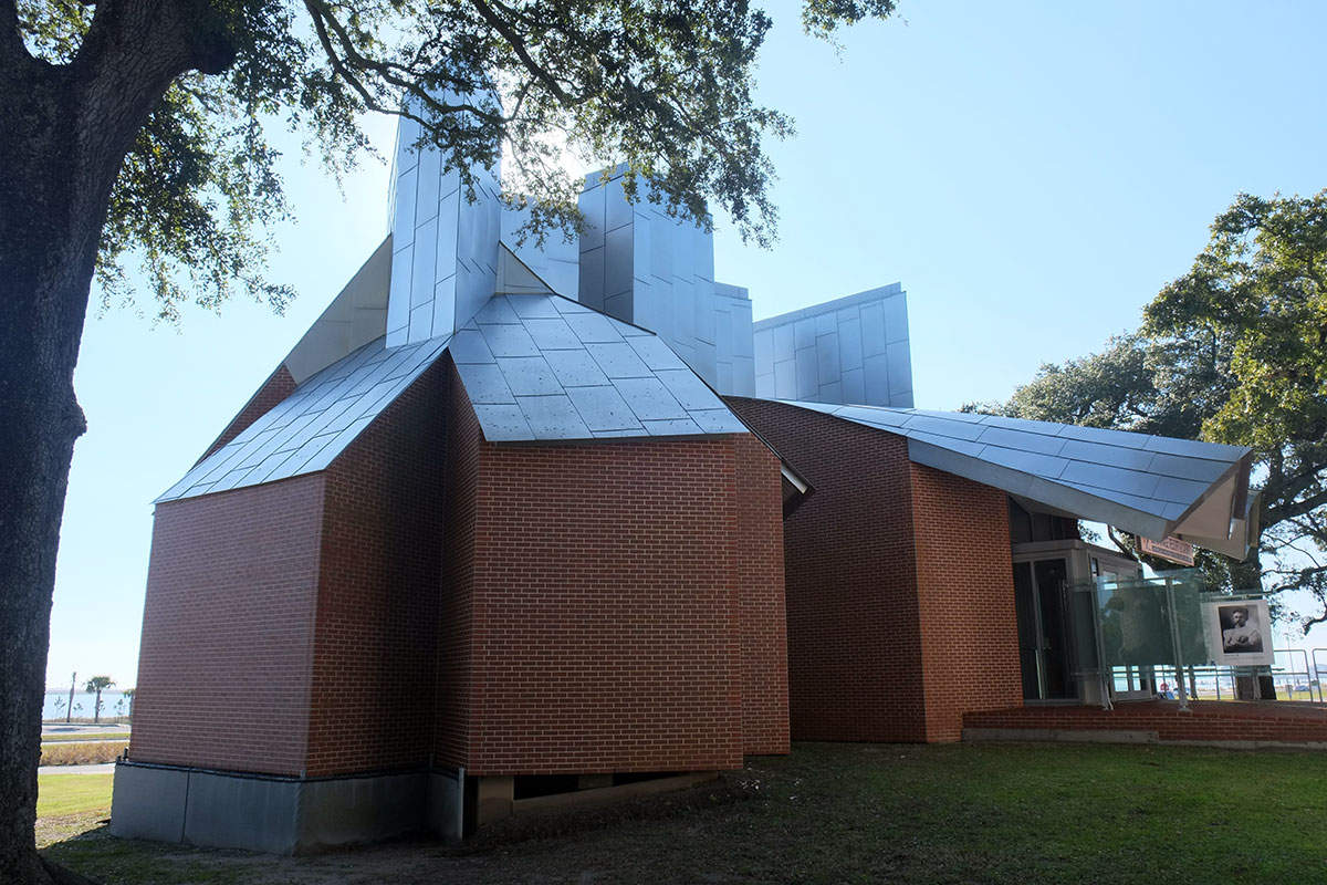 Given the architectural milieu of the South, the last thing I expected to find was a Frank Gehry building. But right there on the Biloxi waterfront, just past the first wave of casinos, is this recent museum by Gehry, primarily designed to house the biomorphic pottery of George Ohr, the Mad Potter of Biloxi. It is actually an ensemble of five new buildings and a reconstructed (post-Katrina) historic one playing off a cluster of live oaks in the middle. As has occurred in some other Gehry projects, the breakdown of scale and the need to engage the landscape leads to more interesting work than when it’s just a large object building.