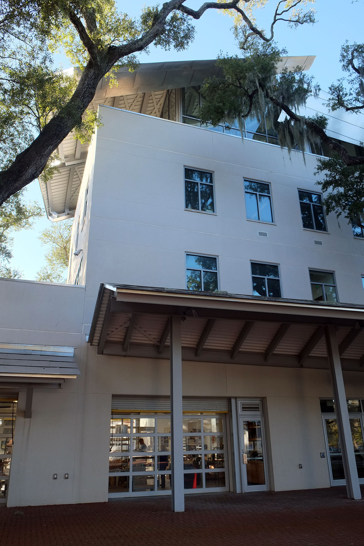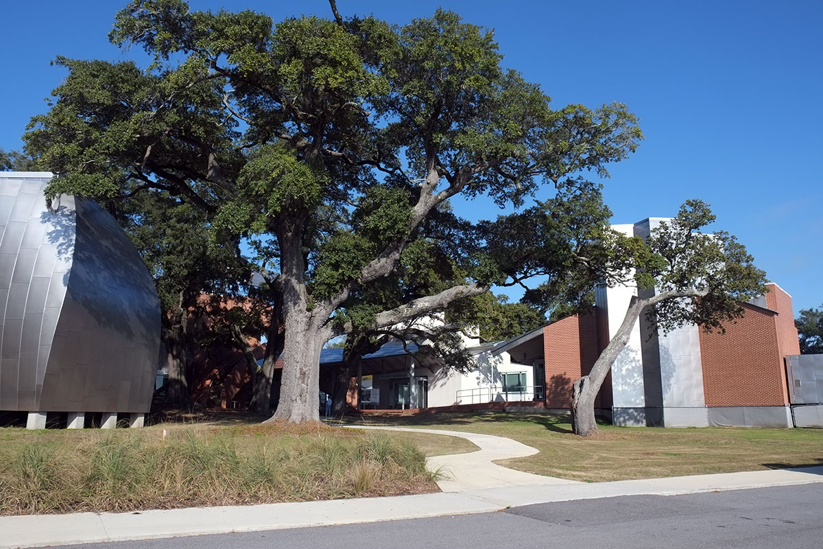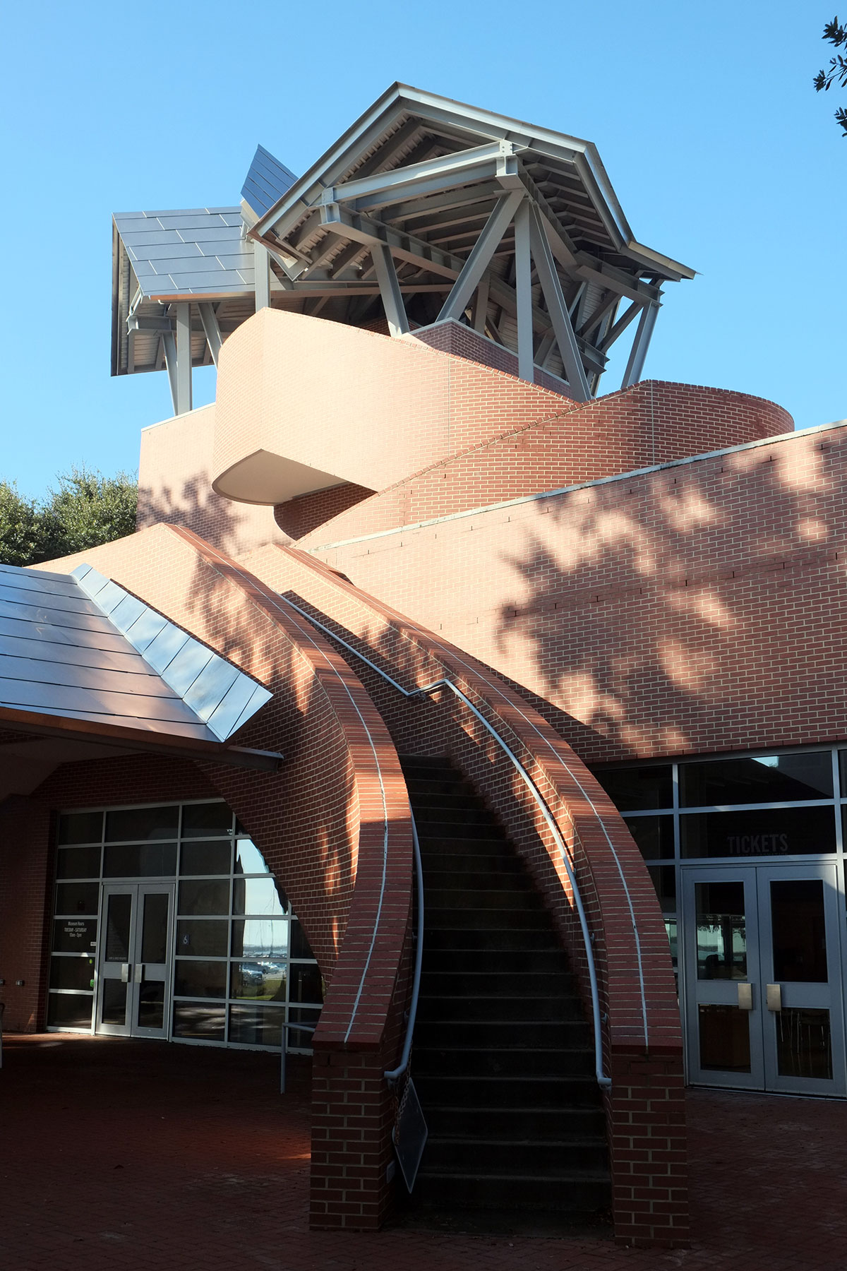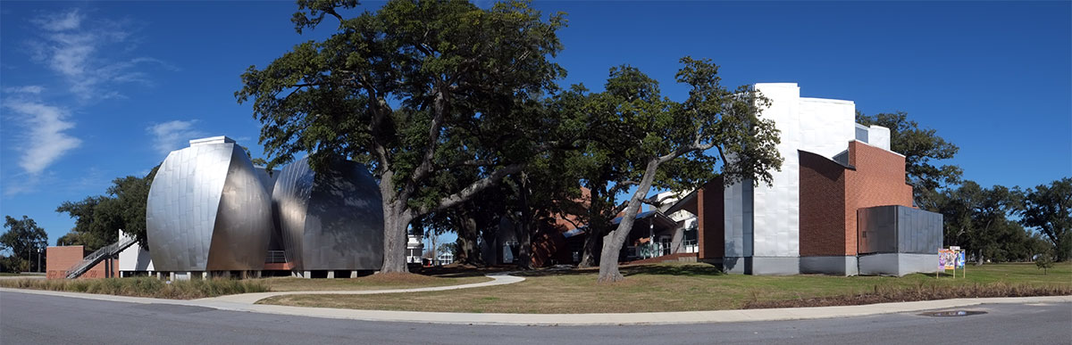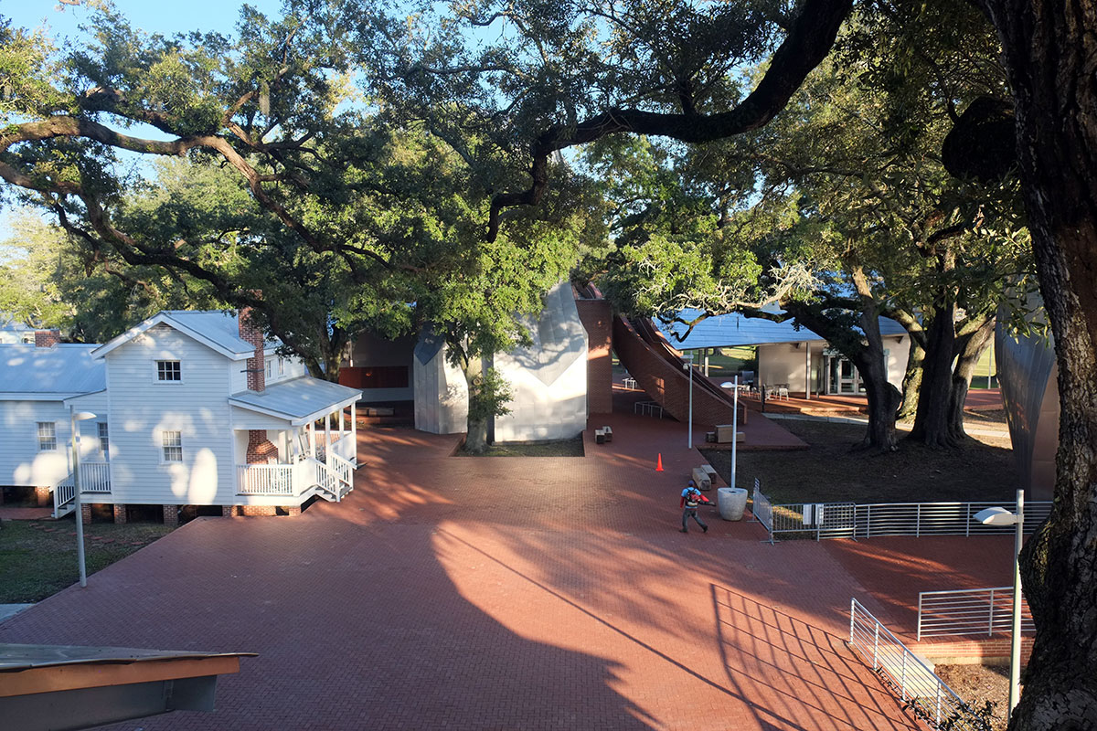 Given the architectural milieu of the South, the last thing I expected to find was a Frank Gehry building. But right there on the Biloxi waterfront, just past the first wave of casinos, is this recent museum by Gehry, primarily designed to house the biomorphic pottery of George Ohr, the Mad Potter of Biloxi. It is actually an ensemble of five new buildings and a reconstructed (post-Katrina) historic one playing off a cluster of live oaks in the middle. As has occurred in some other Gehry projects, the breakdown of scale and the need to engage the landscape leads to more interesting work than when it’s just a large object building.