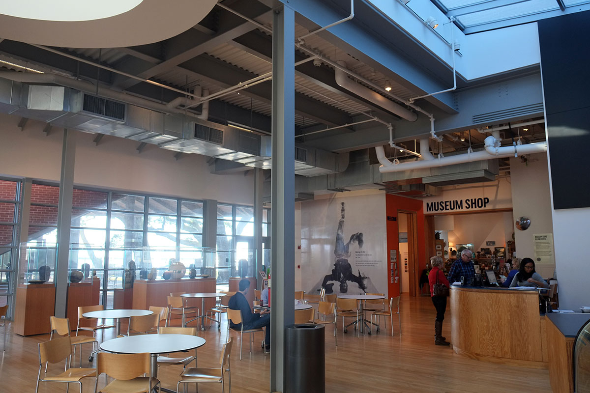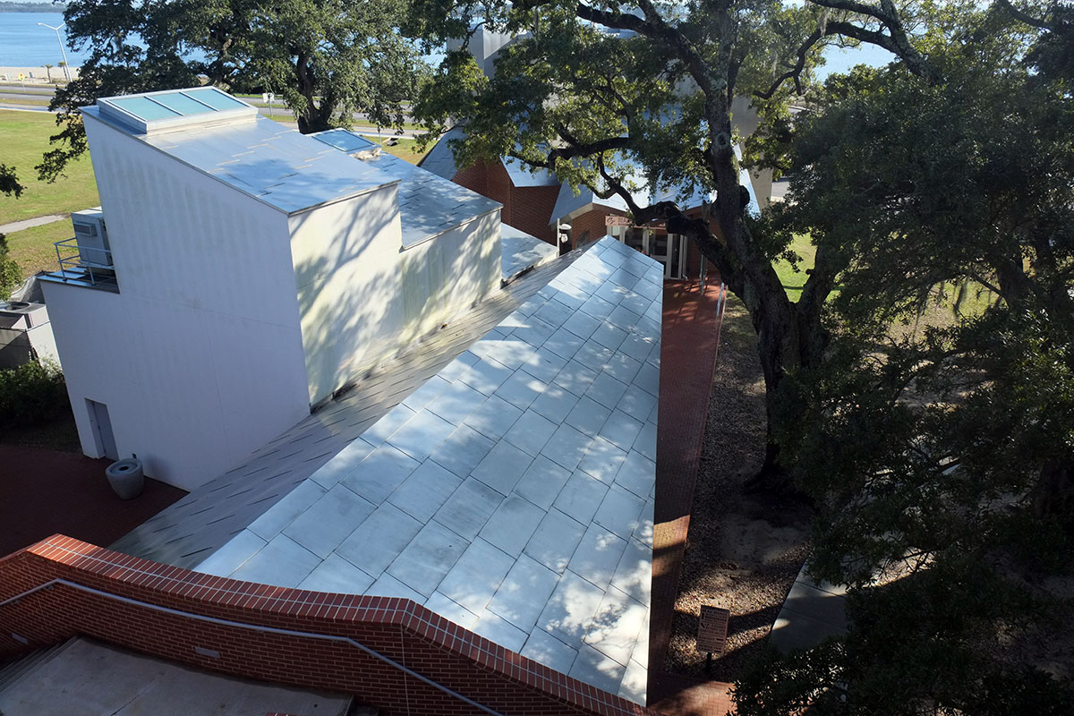 There is a building for African-American art, but at this point half of it is being used for Ohr pottery, as the building intended for Ohr’s work is not yet completed. On the exterior there again is the juxtaposition of differing systems, with brick volumes below and the metal roof above.