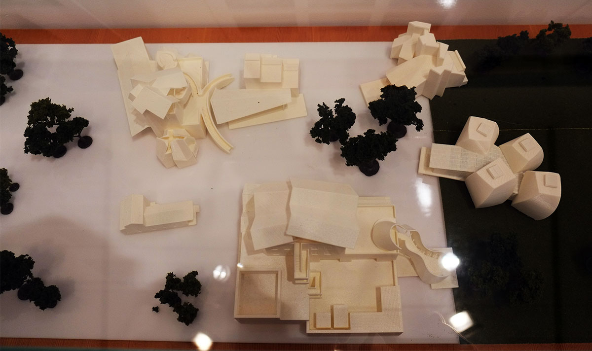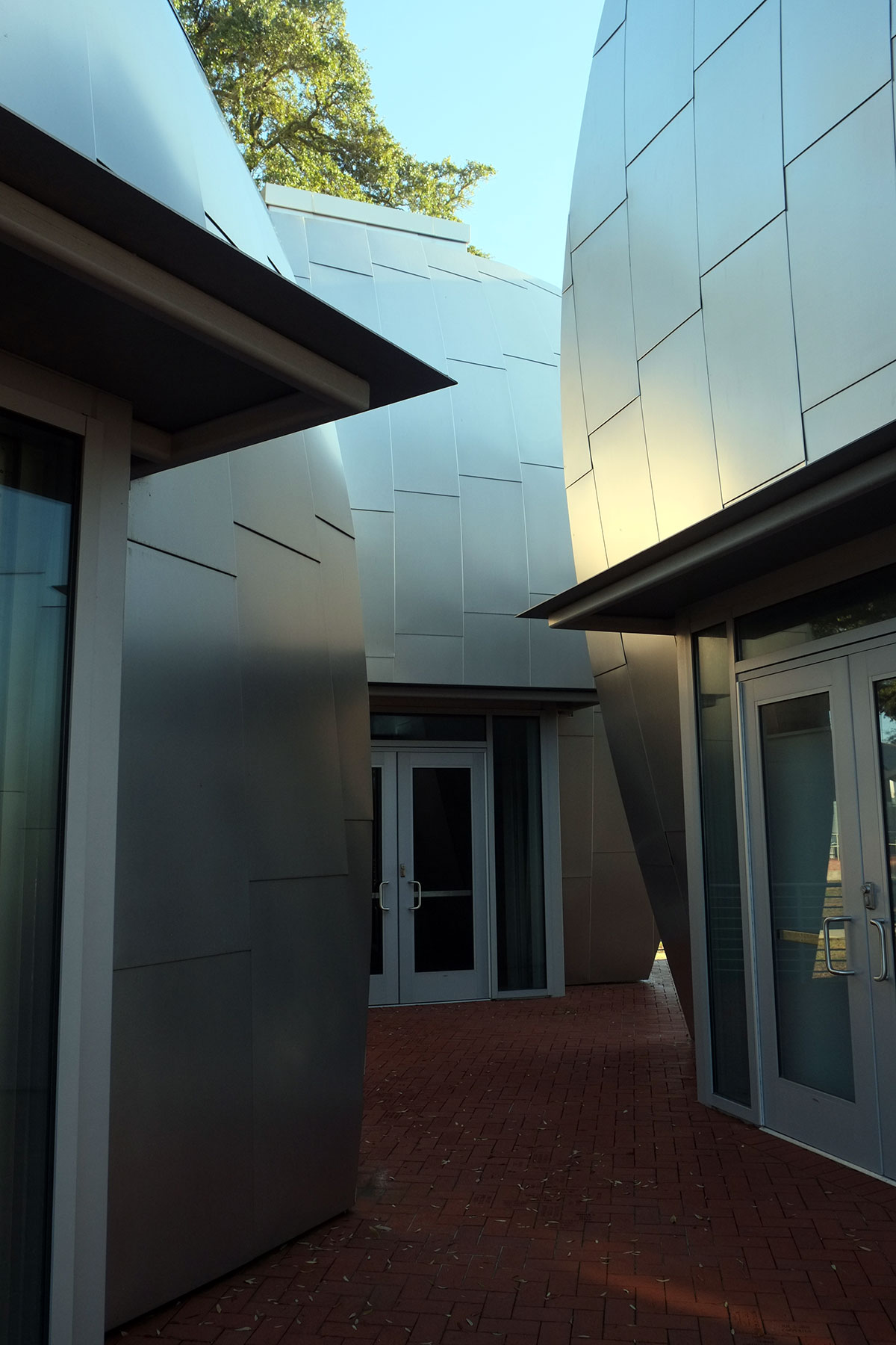 The cluster of four curving metal pods for Ohr’s pottery sits across the courtyard. The contrast between the trees and the metal is beautiful, and the abstract, unified quality (they are just surface) of the pods sets them off from the other buildings.