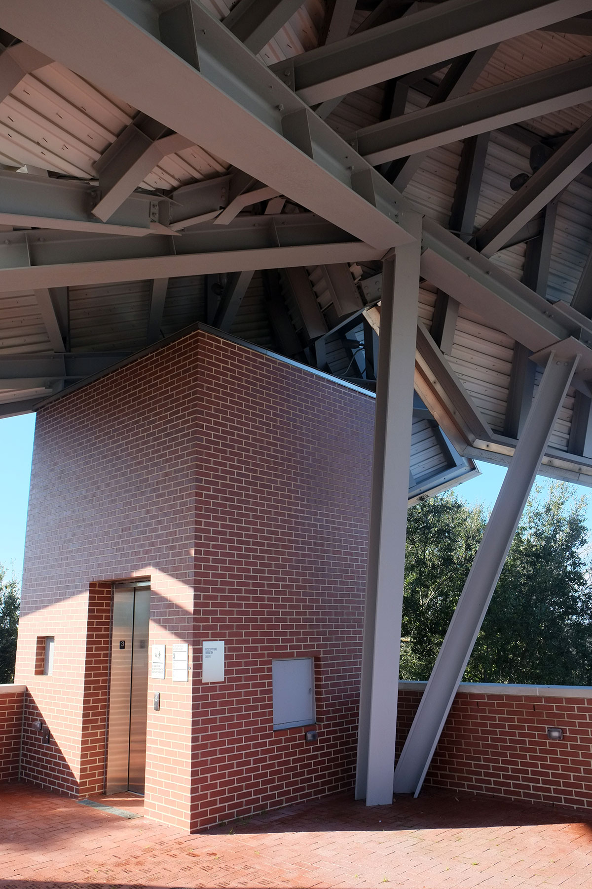 The contrast between the curving brick walls and the linear steel elements which make up the roof framing is kind of fun.