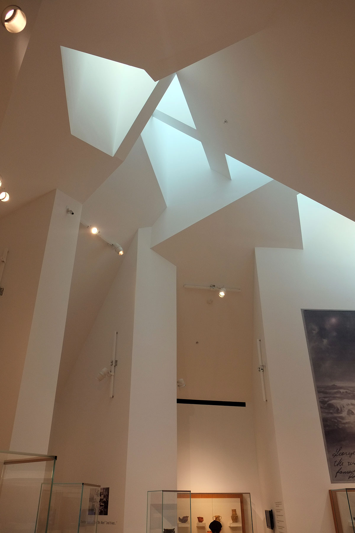 But strangely the interior is all gypsum-board shapes, which somewhat reflect the exterior forms, but the materiality of the exterior is completely absent. There’s a disconnect here that I don’t understand. Is it budget, is it wishing to create a more neutral space for the exhibition of art?