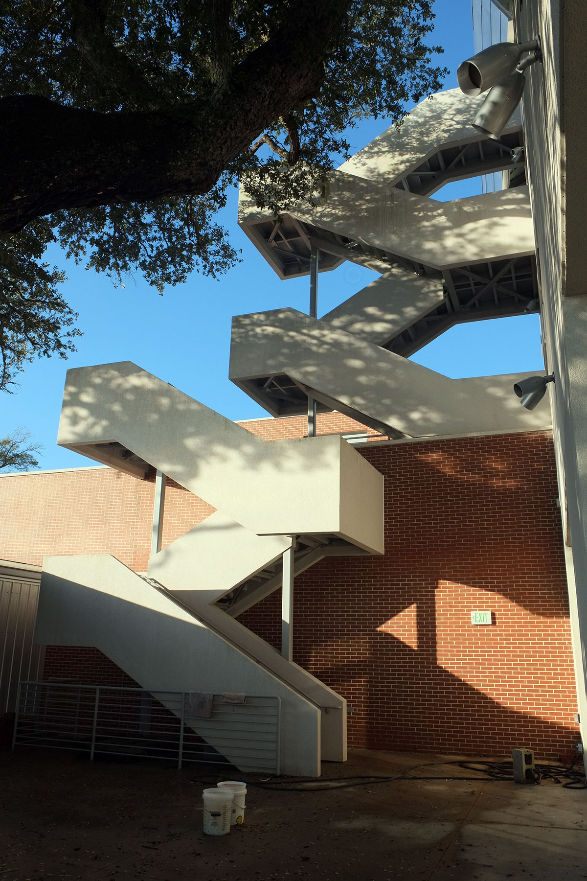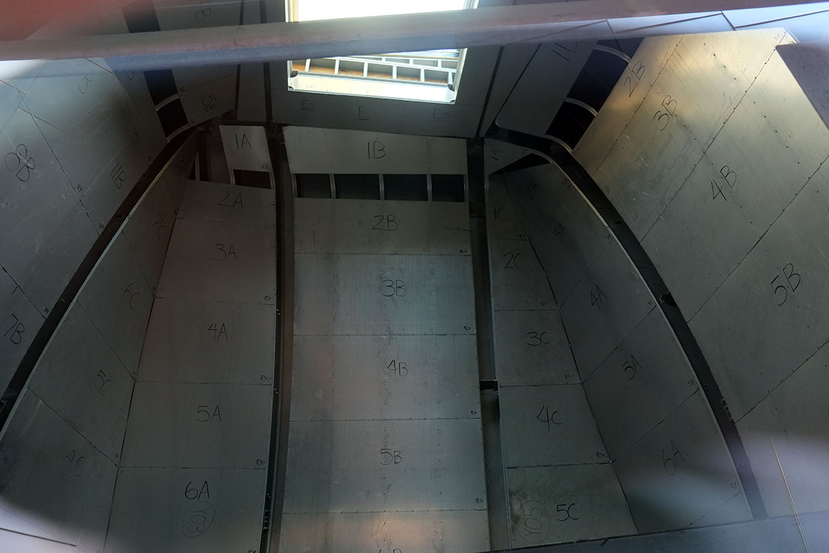 Looking through the door at one of the unfinished pods was revealing – it resembles an Airstream trailer, with a metal skin over large metal framing, and another skin on the interior, which probably provides the shear resistance. But in the one pod which is completed, the interior is again covered in white gypsum board. Early Gehry buildings got a lot of mileage from revealing and using the necessary building elements; I don’t know why he is now covering all that up.