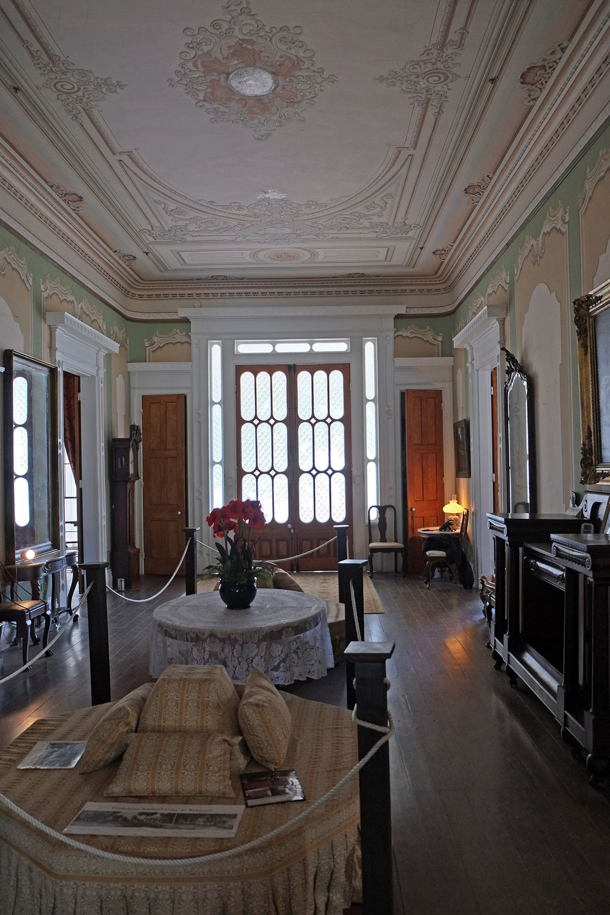 and high-ceilinged parlors and bedrooms off the hall, with painted trompe-l’oeil detailing.