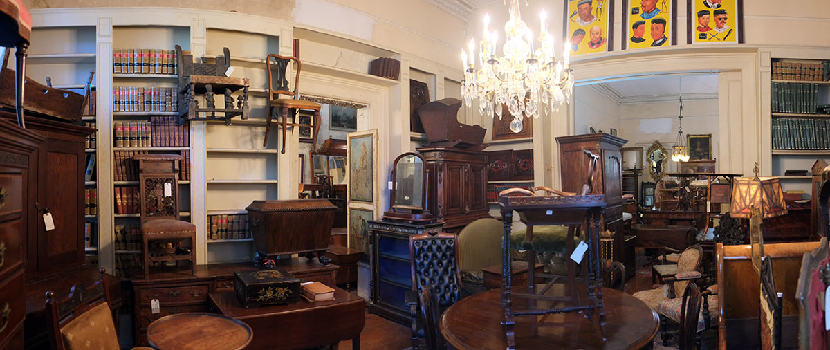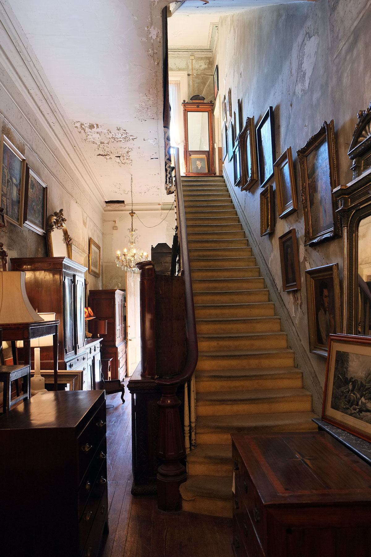 Our favorite building in Savannah is the Alex Raskin antique store. Housed in one of the largest townhouses in the city, it is gorgeously unrestored, owned by a former New Yorker, packed with furniture and cool stuff, and gives you a free glimpse of what such a house is like inside. Partial as I am to Southern decay, I like seeing a house that isn’t all tastefully tricked-out, and where you have to listen to a guide drone on about genealogy.