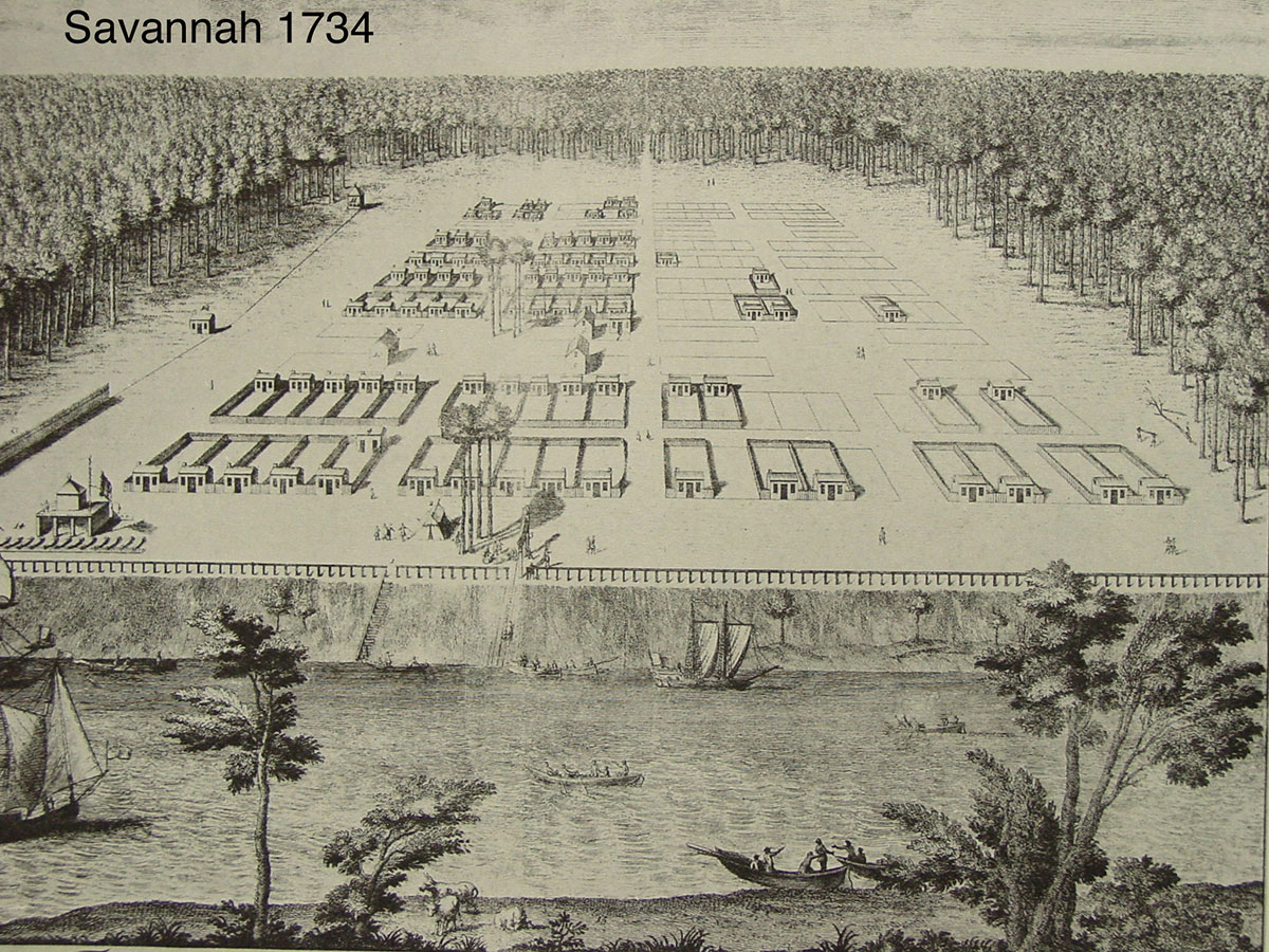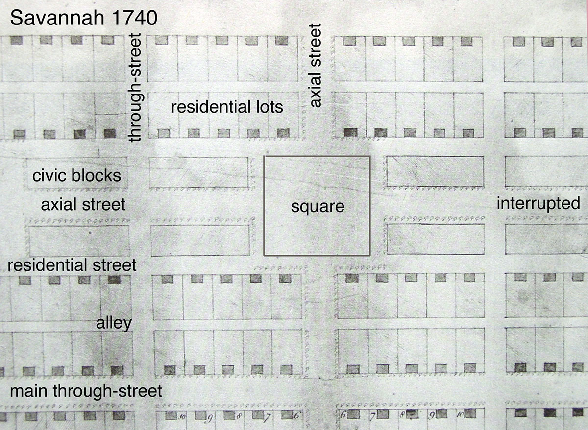 If the character of Charleston depends largely on the building type of the single house, the character of Savannah is wholly dependent upon the brilliance of its plan. It was laid out by James Oglethorpe in 1734 as a military camp, and it is incredible to think that his ideas on the hierarchy of a camp filled with huts could lead to perhaps the most sophisticated town plan in the country. This is the famous print of Oglethorpe’s original layout: