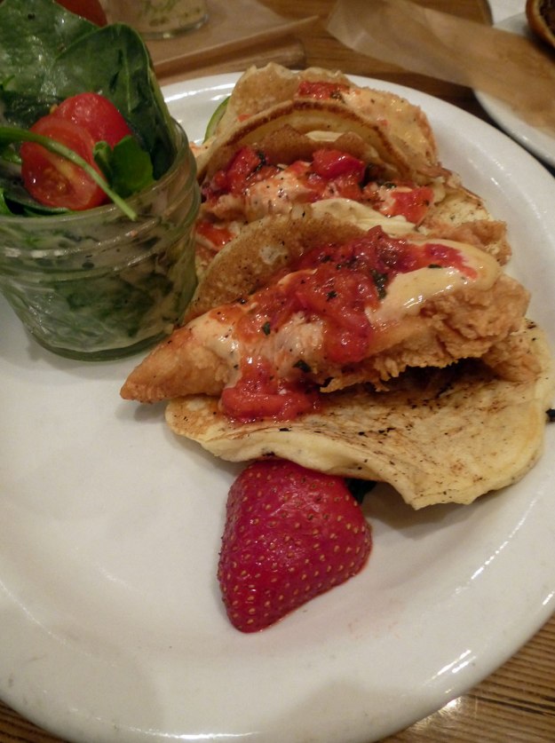 My second favorite dish was the chicken pancake tacos. Lightly fried chicken, slathered with pepper sauce and strawberry salsa, and wrapped in a soft but stable pancake. Sweet was countered with spice, and soft by crunch, all together in the perfectly balanced food.