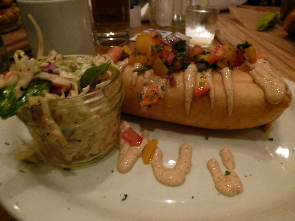 The first thing we tried was pigs in a blanket made with artisanal sausages and dipped in mustard sauce. The biscuit blanket was crispy on the outside, and soft around the meat, which was intensely flavored and delicious. The mustard was the best part in my opinion.