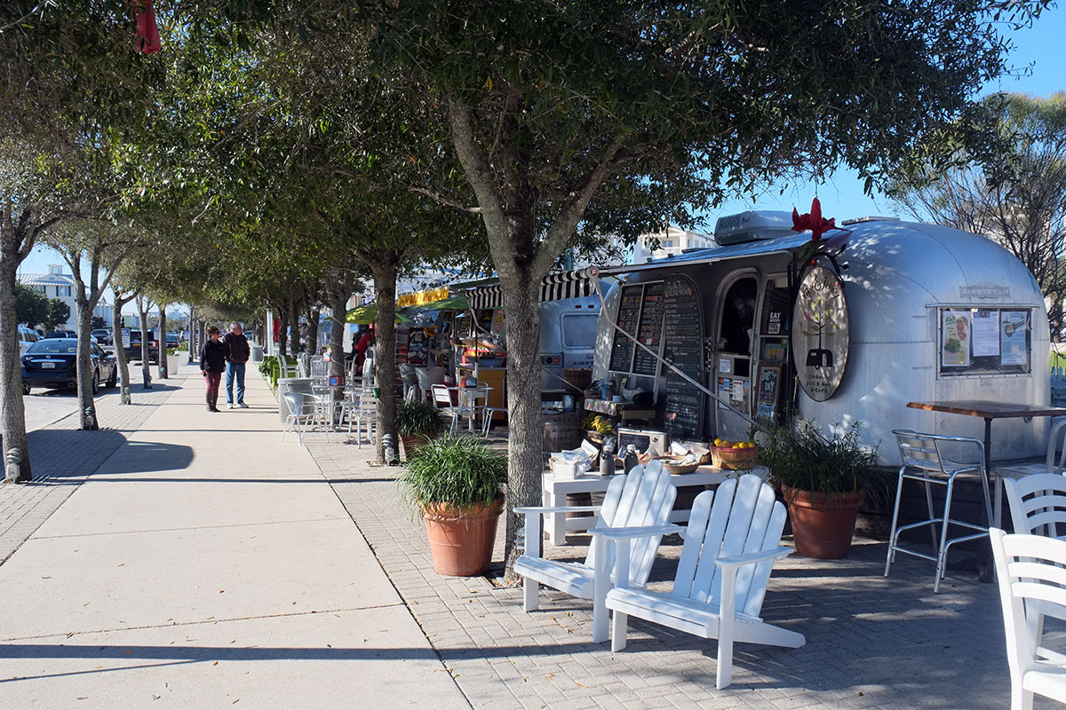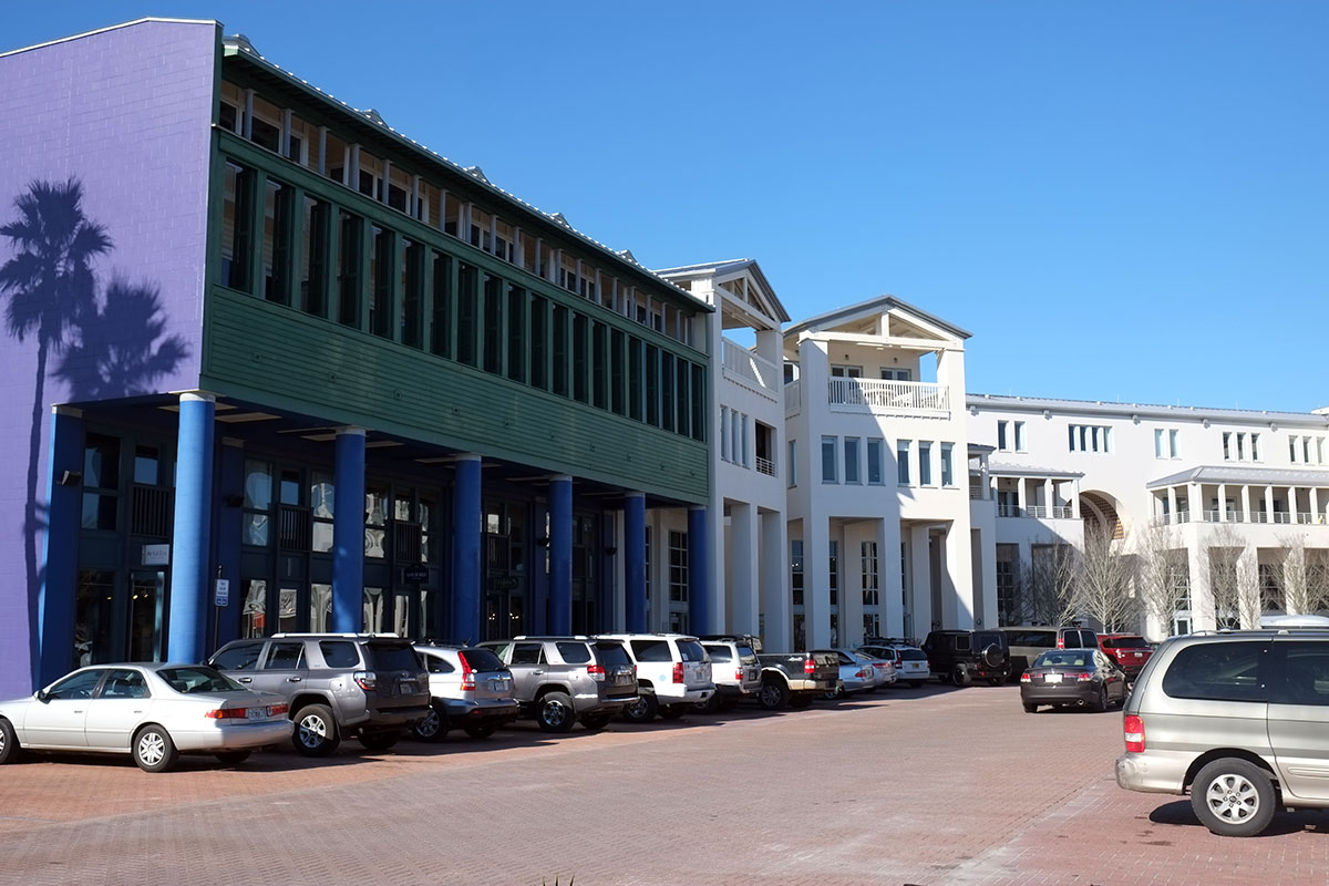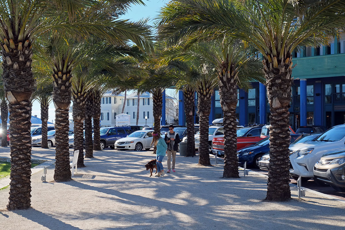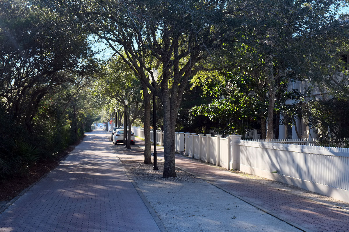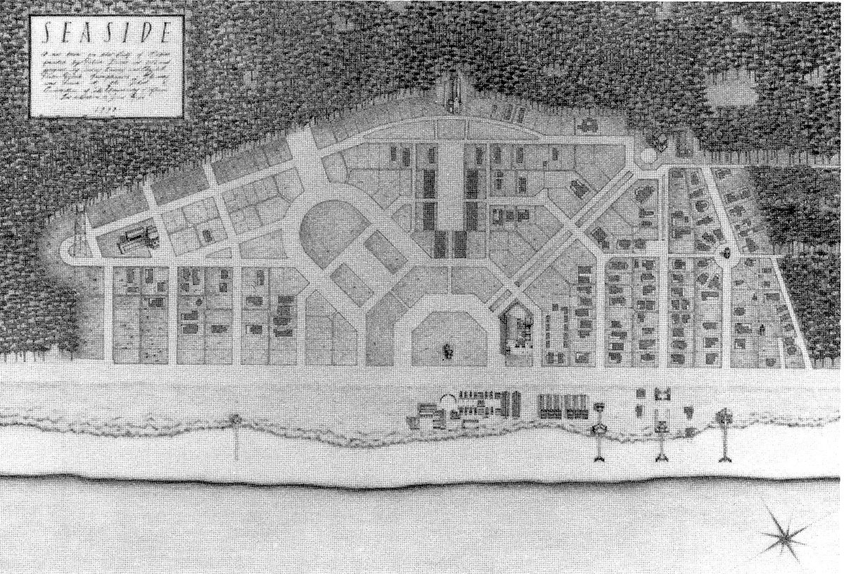 DSCF0747When Seaside, Florida was built on the Florida Panhandle in the 1980s, it was the groundbreaking demonstration of what later became known as New Urbanism.  The architects Andres Duany and Elizabeth Plater-Zyberk (DPZ) worked with the developer Robert Davis to create a beachfront resort town that would harken back to an earlier era, before Americans starting lining the coastlines with condos that segmented and privatized all contact with the sea.  While still in architecture school at Yale in the 70s, Duany and Plater-Zyberk saw through the pieties of modernist town planning, and pointed out how well the neighborhoods of 19th-century American cities worked;  they also drew inspiration from the extraordinary planning of the pre-war era (such as at Radburn:  https://peregrine-nation.com/2015/12/22/radburn-new-jersey).  While Postmodernism was in the ascendancy in the 1980s, making a case against doctrinaire modernist architecture that was strong theoretically but terribly compromised in practice, DPZ led the much more successful and enduring movement to change the way cities and neighborhoods were planned.  DPZ built upon theorists such as Leon Krier and Aldo Rossi, and were able to adapt these ideas to the American context, and even more amazingly, work with developers to put these ideas into practice.  The property for Seaside had been owned by Robert Davis’s family for decades, and luckily by the time he came to develop it, their design practice had caught up with his vision for a traditional town.