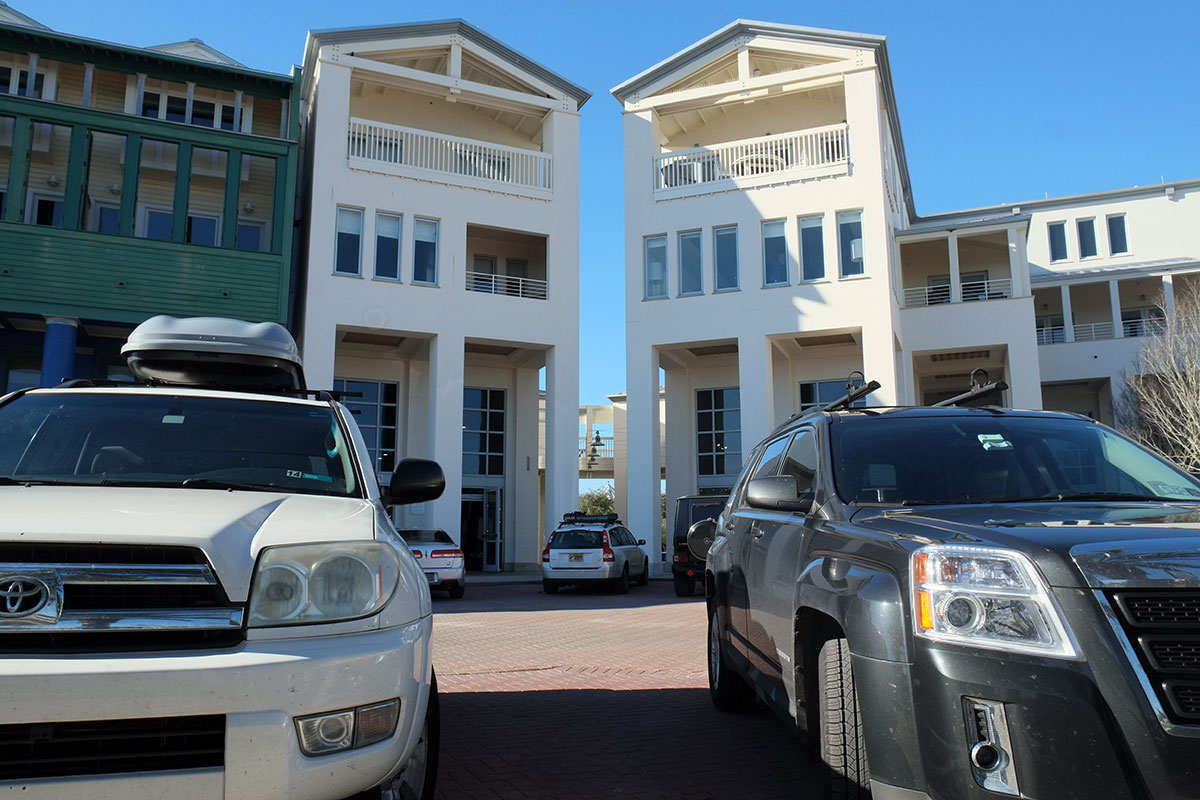 This isn’t really the designers’ fault.  Back in the early 1980s, no one anticipated that the vehicles of the future would dwarf all those of the past – we thought they’d continue to get smaller and more efficient.  In fact, one of the tenets of New Urbanism was that on-street parking was a good thing – it slowed down traffic, and it separated pedestrians on sidewalks from speeding cars.  But the huge vehicles of the present have overwhelmed the spatial design of the public sphere – when you look across the green at the center of town, you mainly see a wall of cars, and as you walk down the sidewalk, you feel boxed in by cars.  Perhaps this isn’t bad on a four-lane avenue in LA, but in what used to be a pedestrian-oriented town center in Seaside, it’s unpleasant.  It’s not a center or a street, it’s a parking lot.  DSCF0691