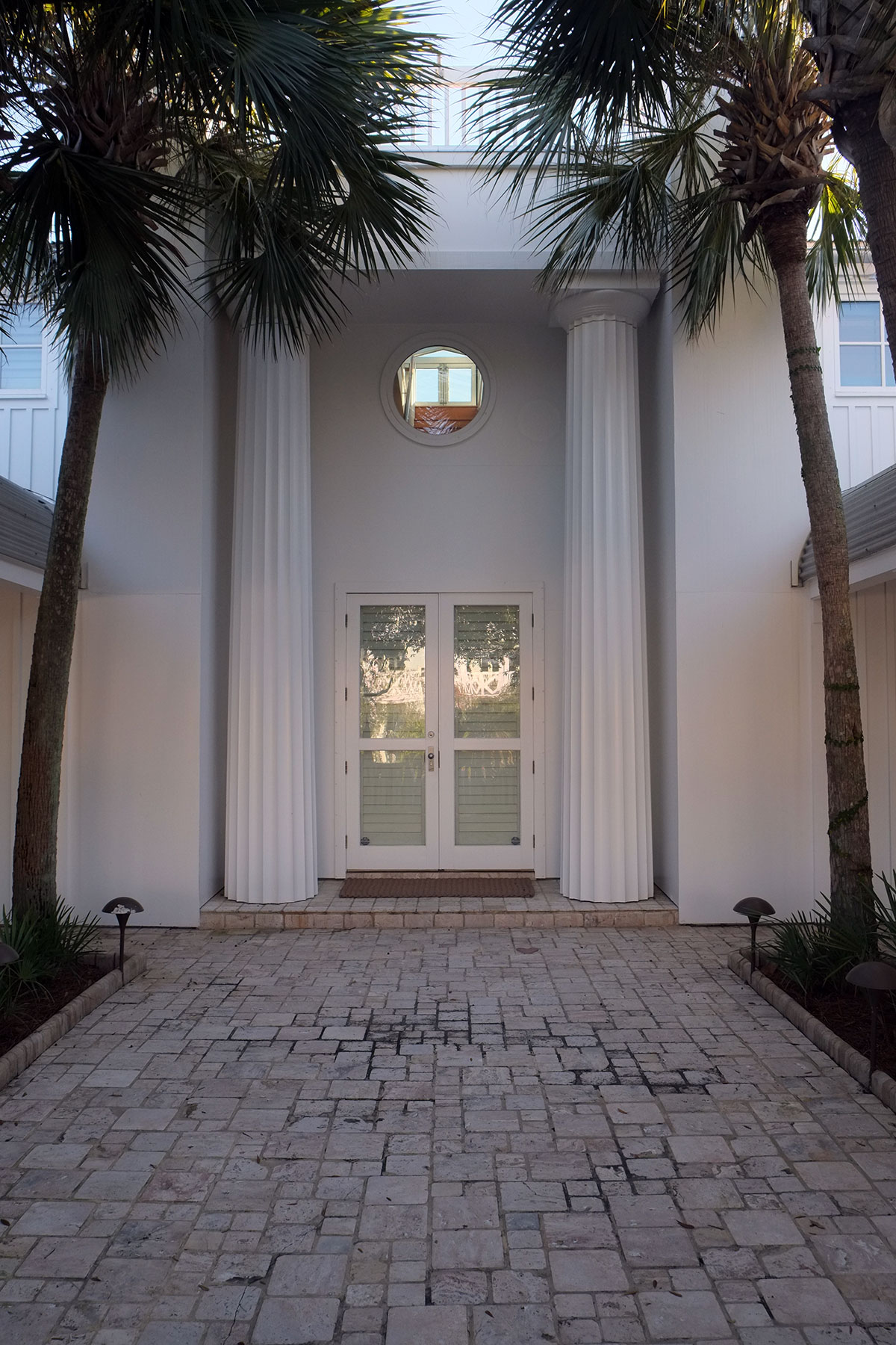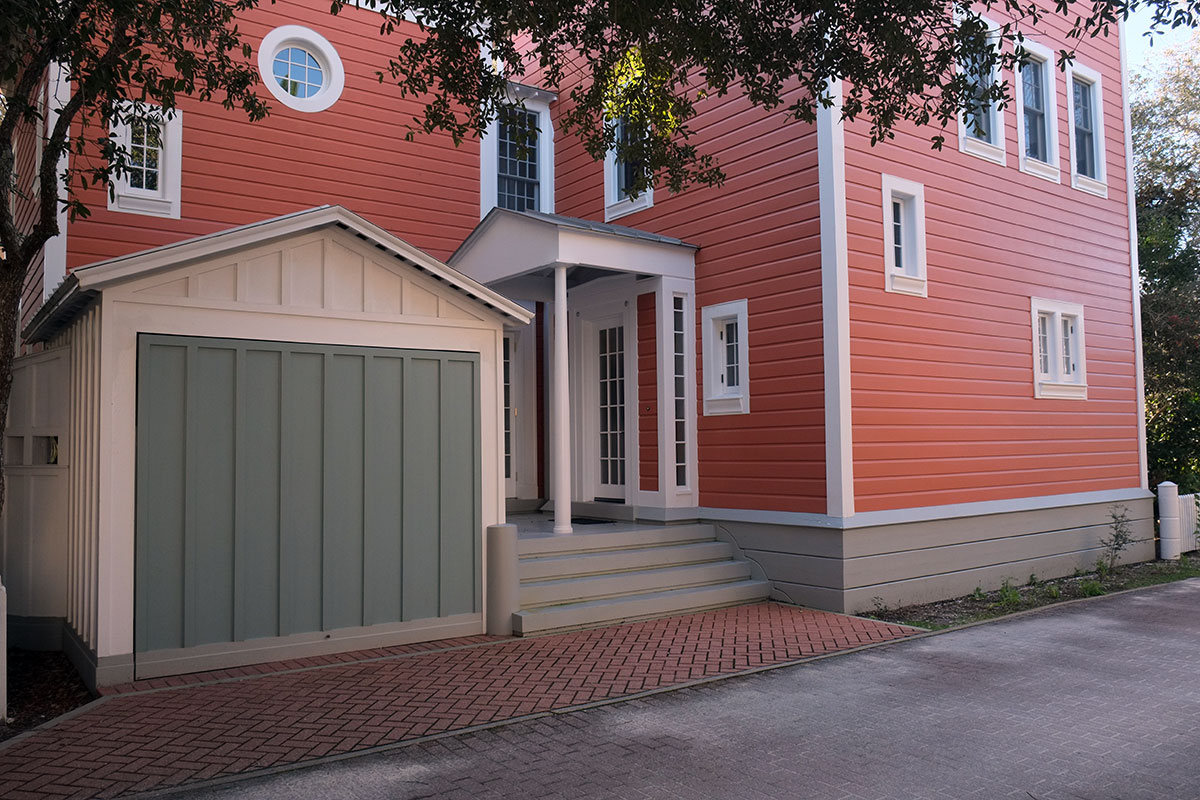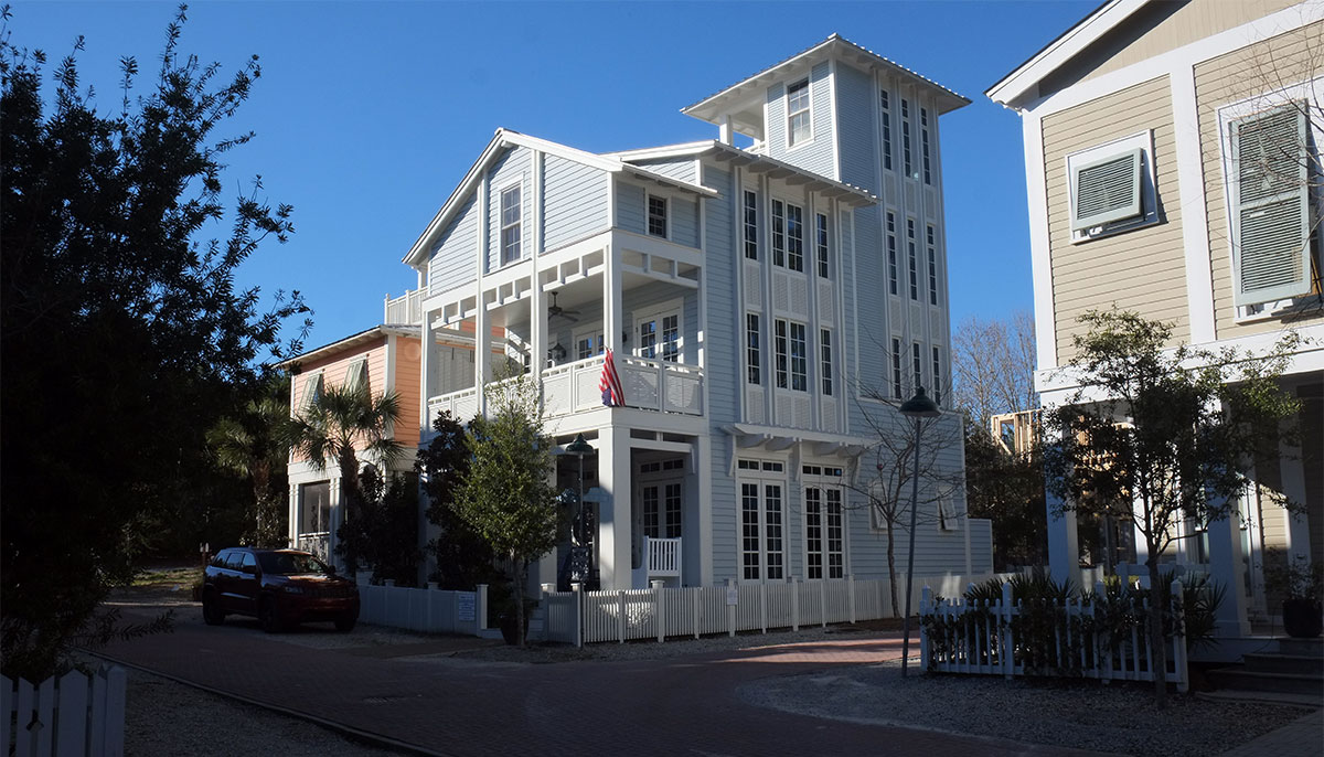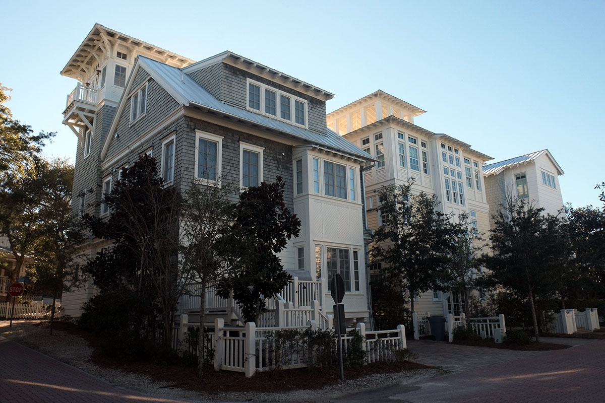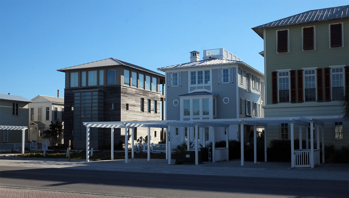By the mid-1990s, this had already started to go awry.  Seaside was a victim of its own success.  It was so different from standard practice, and such a beautiful overall environment that it was splashed across the media and attracted the attention of the upper middle classes from places like Atlanta.  They arrived with money, ideas and intentions that didn’t reflect the initial ideas about simplicity.  They followed the explicit rules, but when they pushed the boundaries, it wasn’t in the direction of interesting architecture, it was in the direction of trying to build something as close to a suburban Atlanta McMansion as they could get away with (with a lot more historicist detail glued on).  The east side of town has most of the early, elegant buildings, while on the west side, the newer, more ostentatious houses appeared:  Seaside091  Seaside092