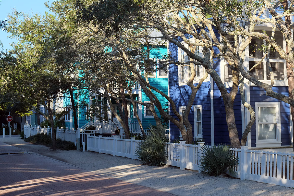 The second innovation at Seaside was the Code, which was a radical revamping of zoning.  Instead of specifying all the things and places where and how you couldn’t build, in every district house location and type was spelled out, and architects had a clear direction to follow.  This differs markedly in different places in the town, the intention being that the building designs support the overall character of the various public spaces.  There are small-scale streets, grander streets, streets where the houses determine a street wall, streets where the ambience is more that of small bungalows.