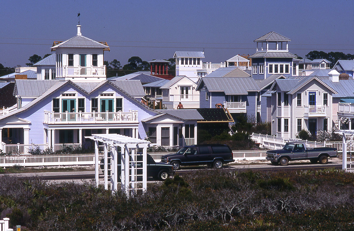 This is another blog post which parallels one of my pre-existing lectures.  In explaining the reactions to modernism in the late 20th-century, I use Seaside as an illustration, as it is very clear how the ideas were put into practice.  I visited Seaside for the first time in 1994, and on this trip I was most interested in seeing how it had evolved and changed in the intervening years.  I found that most of the original architectural and planning ideas had stood the test of time quite well, but at the same time I felt that the earlier promise and innocence of Seaside had been lost.  I don’t think the fault is with the design, but rather mainly reflects the direction in which our society has moved in the past thirty years.