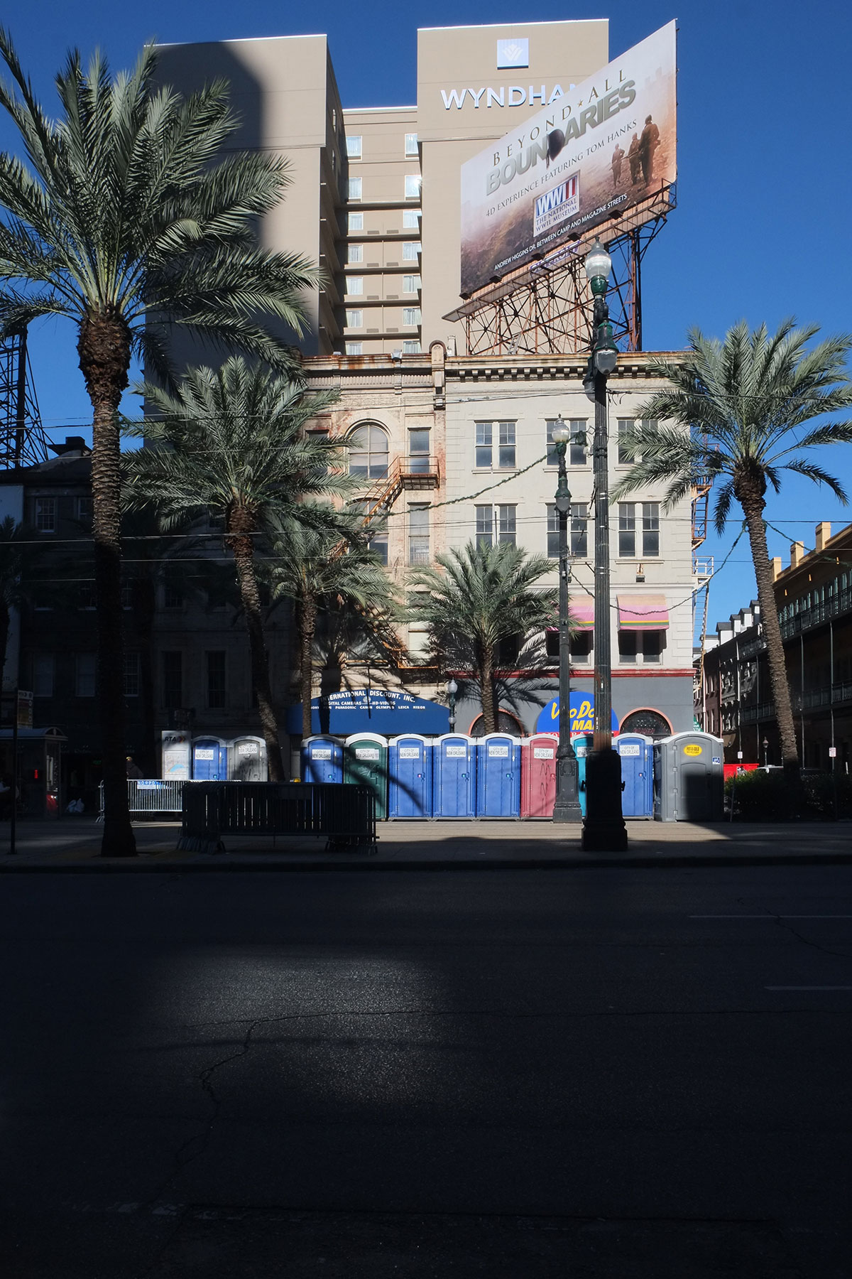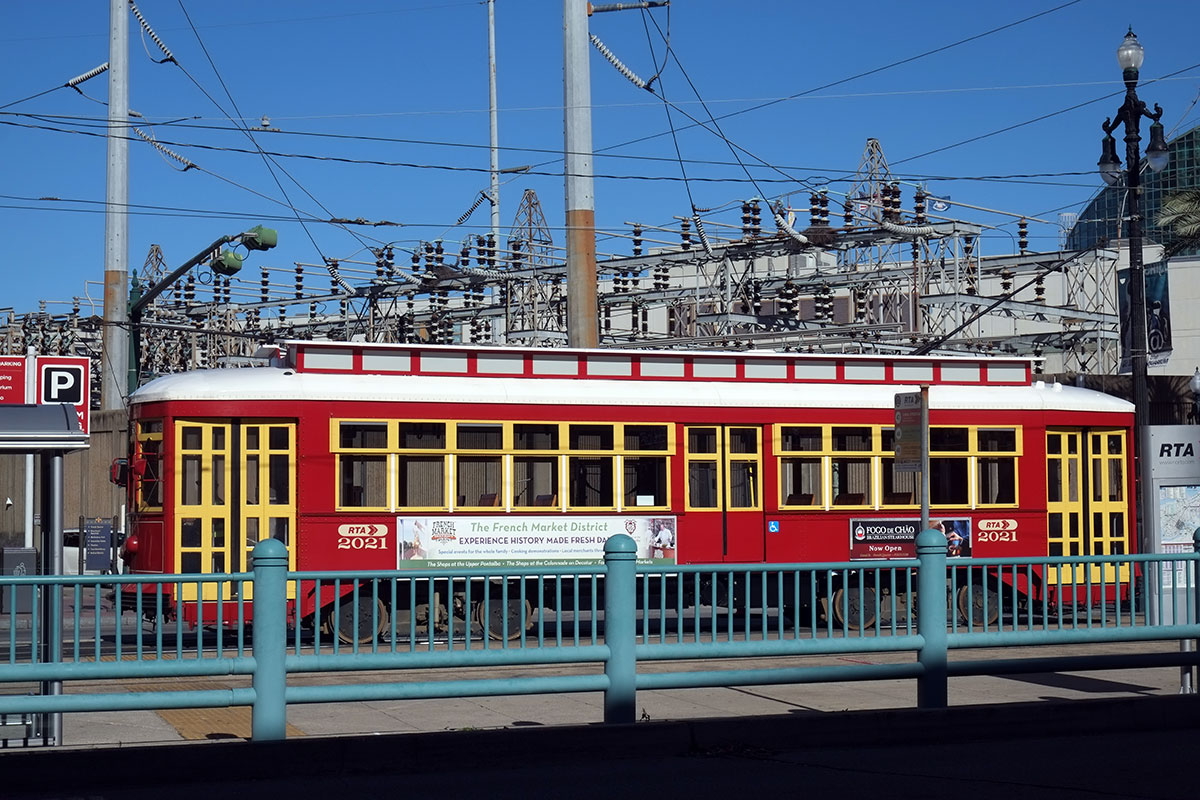 The buildings form a continuous wall, there are streetcar tracks up the center, and a double row of palm trees.  Bright lights, traffic, tourist attractions and hotels – it is an entertaining and exciting space, one that says, this is a big city.  Also a tropical city – with its white facades and palm trees, Canal feels very different from the grey avenues of the north.  DSCF2041p  One of the two streetcar lines runs up Canal, and it is a joy.  The old cars are fabulous, and here as on St. Charles, you ride along experiencing the city as it goes by.  DSCF2034DSCF2822