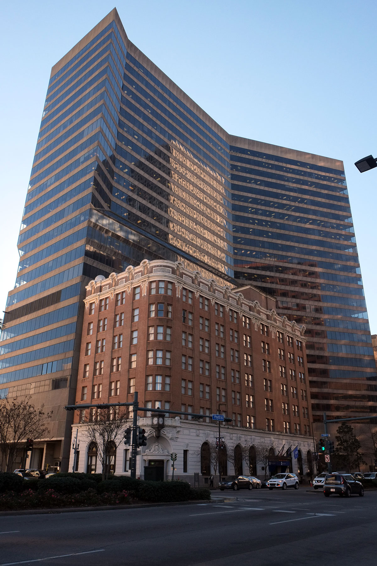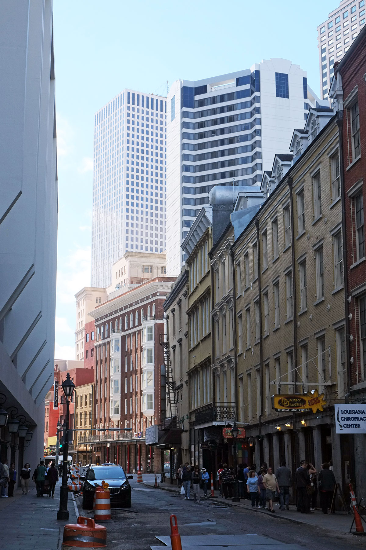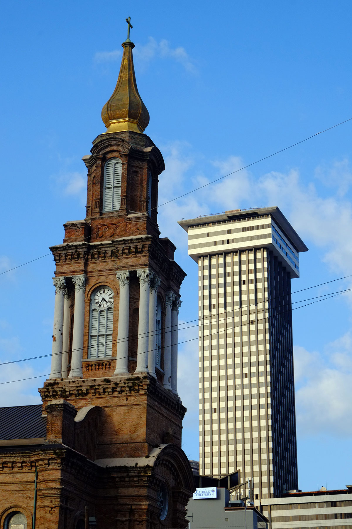 The more recent towers, spawned by the oil boom, are clustered upriver along Poydras Street.  DSCF3792  DSCF2058Overall, there is balance between the old and the newer – there are not many places where the gigantism and banality of recent decades takes over.  Although New Orleans’s first skyscraper, the Plaza Tower, is truly inept.  It is now empty, with asbestos and mold issues, and lawsuits apparently flying in every direction.  It’s so bad it might be worth keeping.  DSCF2626