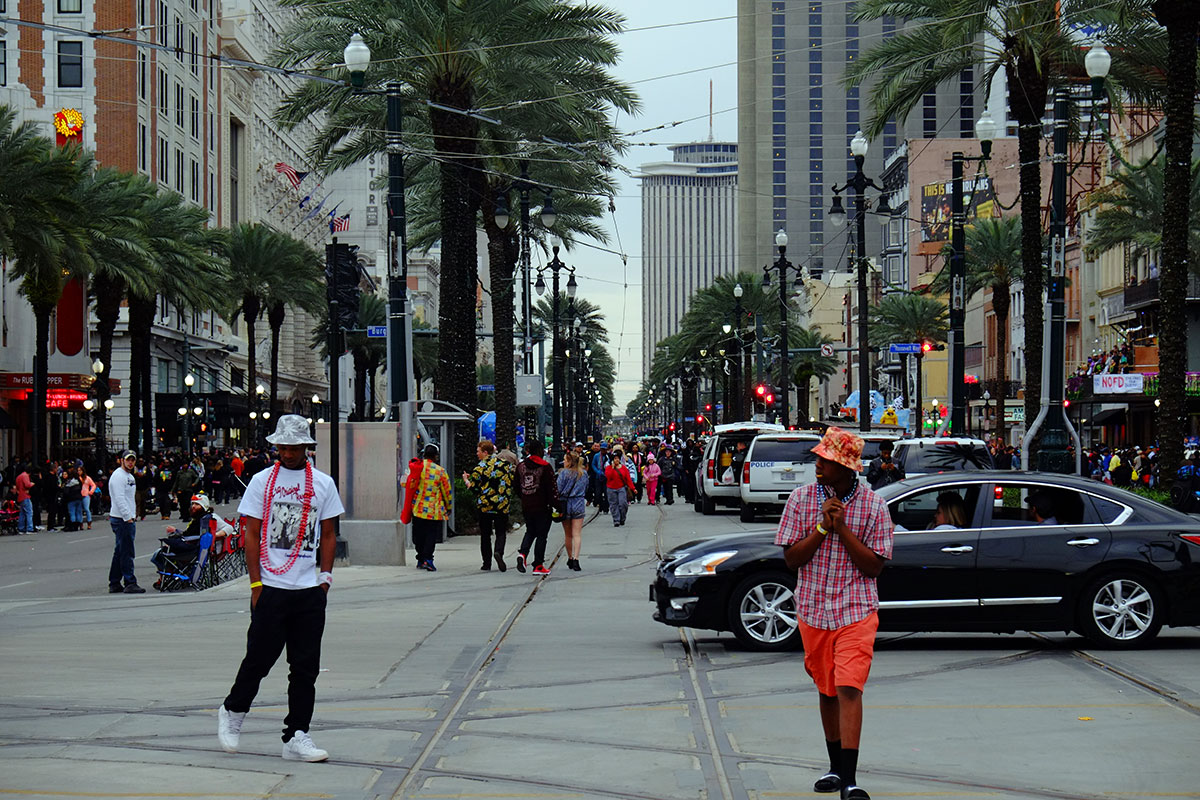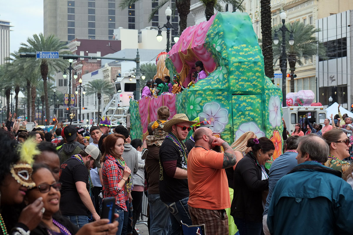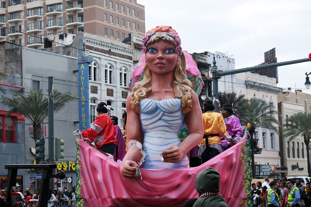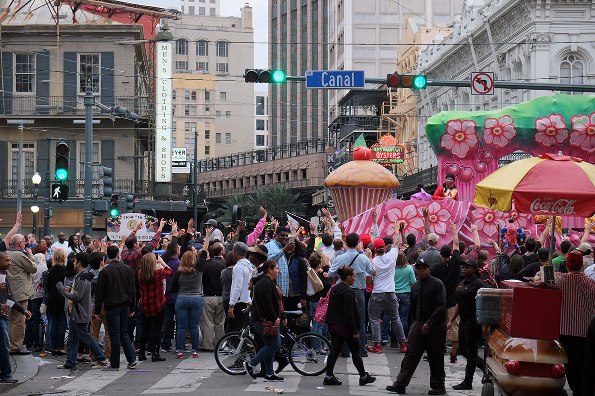 Canal really comes into its own on Mardi Gras – all the large parades end up here, heading up one side of the neutral ground (median) and back down the other.  The scale of the street works with the large crowds and floats – it reminded me of Broadway in New York with the Thanksgiving parade.  DSCF2277  DSCF2265  DSCF2267