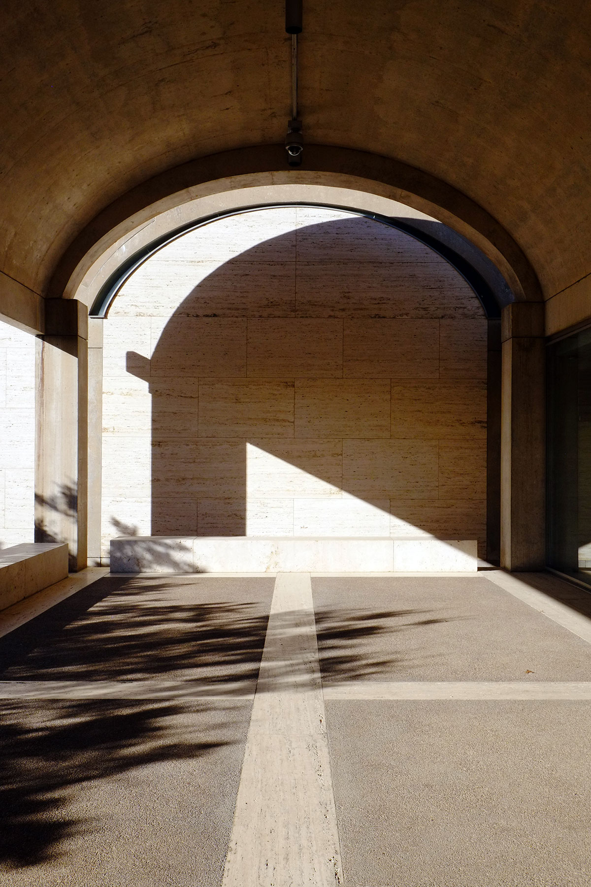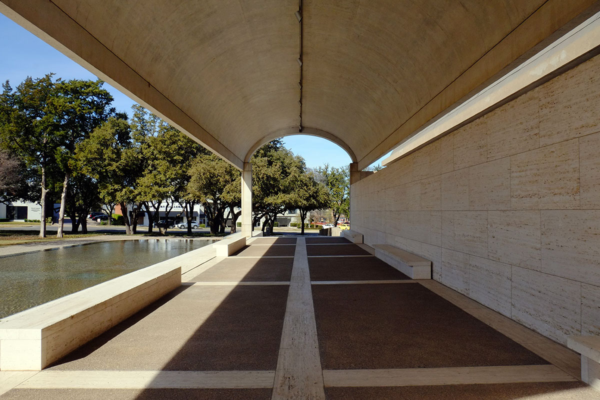 Of all of Kahn’s major works, the Kimbell was the one I always found least interesting. It just seemed too simple – come up with a bay cross-section that’s supposedly good for daylighting, extrude it to an absurd length, then repeat that bay module in a slightly-varied way. Of course it’s rigorous, it’s subtle, it’s beautifully-detailed, but I thought the spatial experience would just be too uniform. I was wrong. It is the perfect example of how playing within a strictly-controlled system can lead to a lot of richness and experiential variety. The modules are used to make long rooms and short rooms, narrow rooms or wide rooms, they open up at the end or the side, they are left out and so create spaces not strictly within the system – such as the entry court or the small internal courtyards. Or walls are left off and it becomes a loggia.