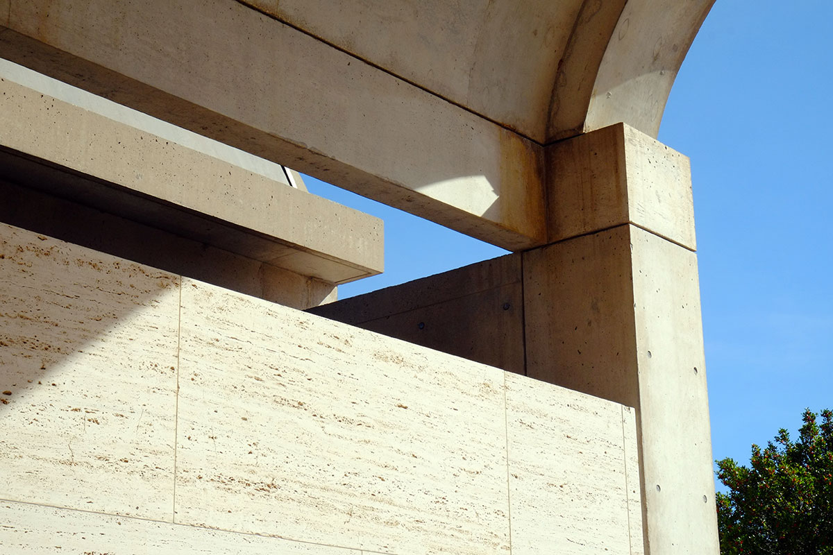 The contrast is revealing. Kahn’s work may be tectonic, in that the columns, vaults, infill panels, etc., are all expressed and articulated, but when you look closely, you have to admit that there is a lot going under the skin that you don’t see. That isn’t a travertine wall, it is a concrete block wall covered in travertine. He is not trying to fabricate a completely abstract surface, such as in the work of other architects the period, but neither does he want you to see the real guts of the building.