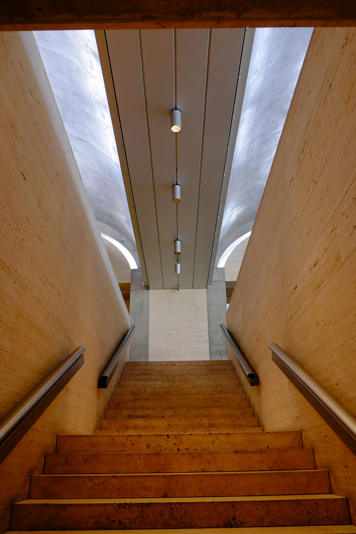 There are a few things that seem a little unsystematic, such as the fire stairs. The vaults meet at a relatively narrow channel/beam, which doesn’t provide enough width for services such as fire stairs. So Kahn sticks the stairs at the end of the building, poking out a bit, and then tries to hide them with travertine.