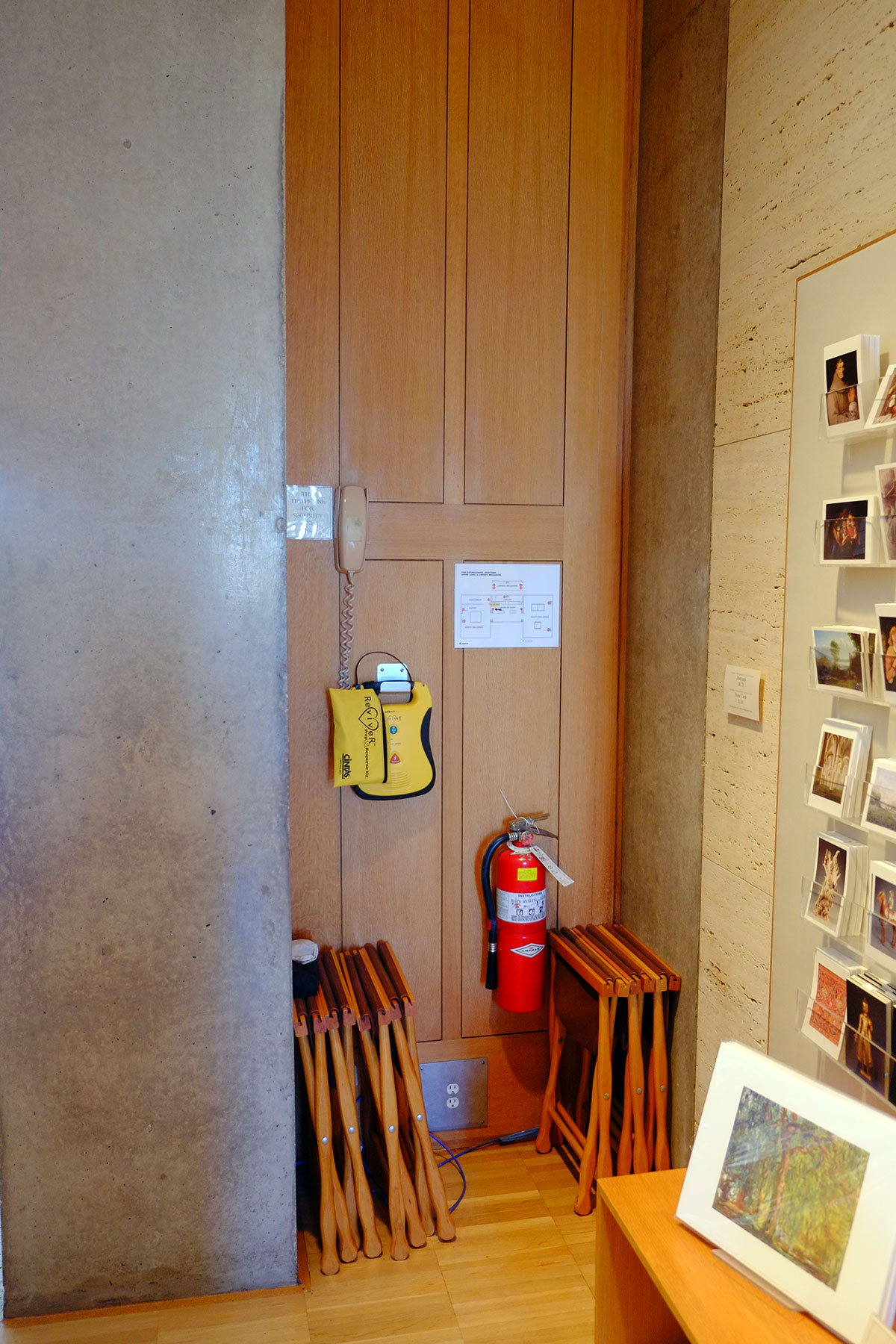 but they then drop you at kind of a funny point – facing a wall not quite in the museum, sort of in the bookstore, looking across to the courtyard area facing west. It’s a problem with a modular building – how do you emphasize entry or centrality, when every bay is equal? The new entry sequence from the Piano building is much better – after parking under the building, you head up a new funny little stair, not unlike Kahn’s, then turn, and see the Kahn building across the lawn. This is the intended main entry, but it took the Piano addition to get you there.
