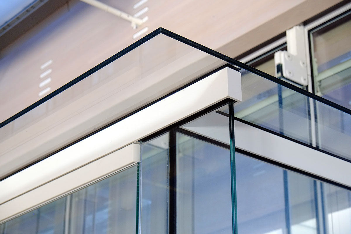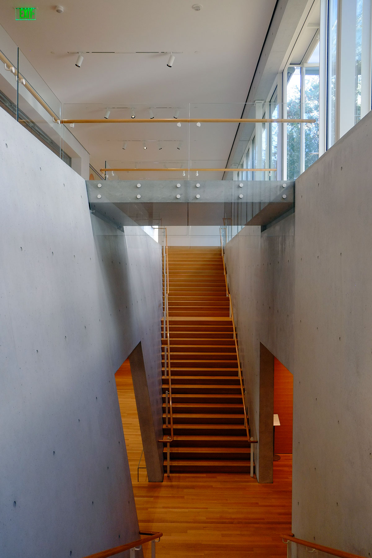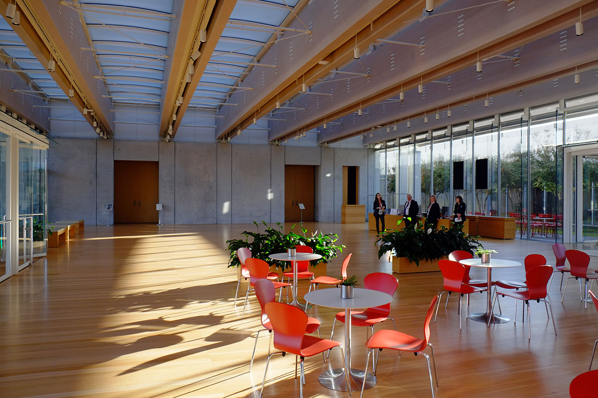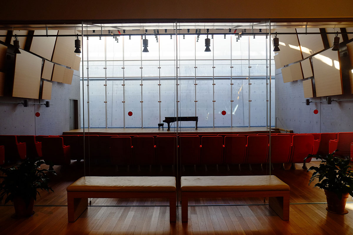 The auditorium is a two-story volume, the west wall of which is completely glazed, with light bouncing off another concrete wall outside.