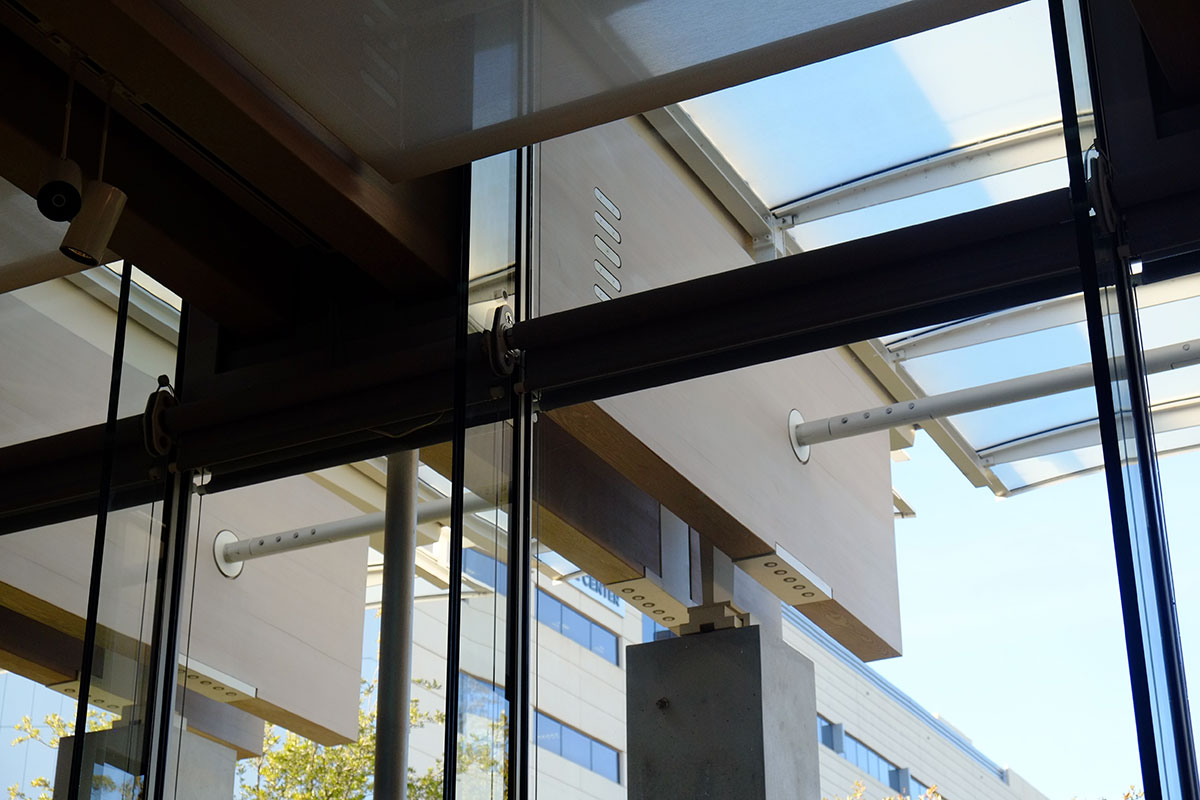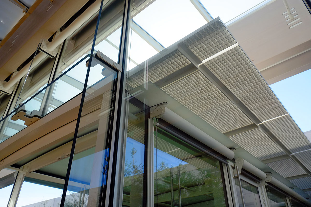 Kahn had the advantage here of working sui generis, whereas everything Piano subsequently did has to be seen in relationship to Kahn’s building. The basic dichotomy is great, and plays to Piano’s strengths: if Kahn’s building is about mass, walls and vaults, Piano’s building will be about frames, panels, joints and beams. His building mirrors Kahn’s across the lawn in its north-south linear bays, its use of the east-west cross axis for entry, and in its symmetry. But then everything about the tectonics is different, and in the typical Piano vocabulary.