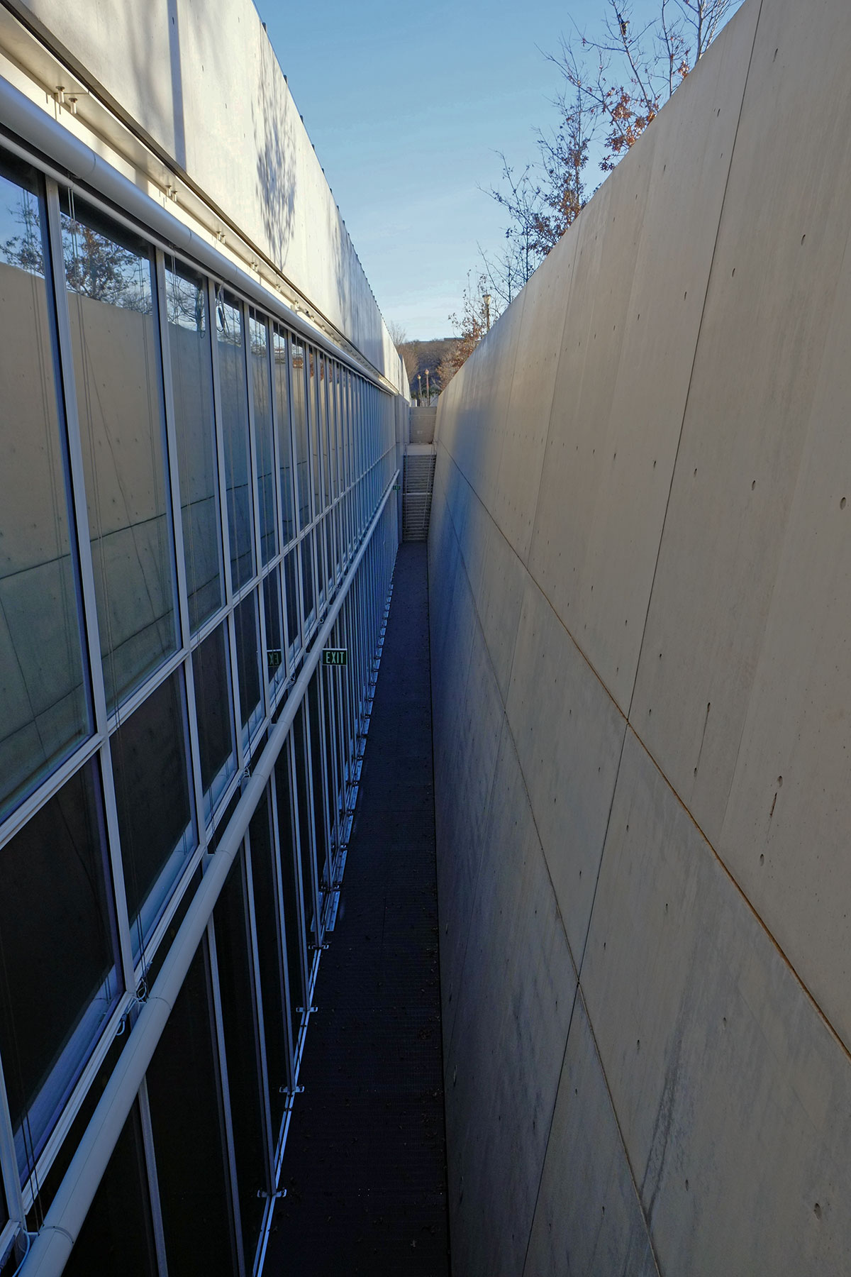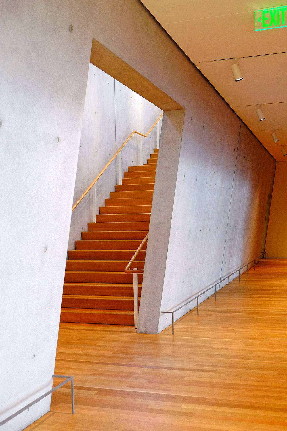They are bound by two massive concrete walls, one of which is tilted. This being Renzo Piano, there must be reason for it (with most other architects these days, I wouldn’t even bother to ask why), but I couldn’t figure out what the reason was.