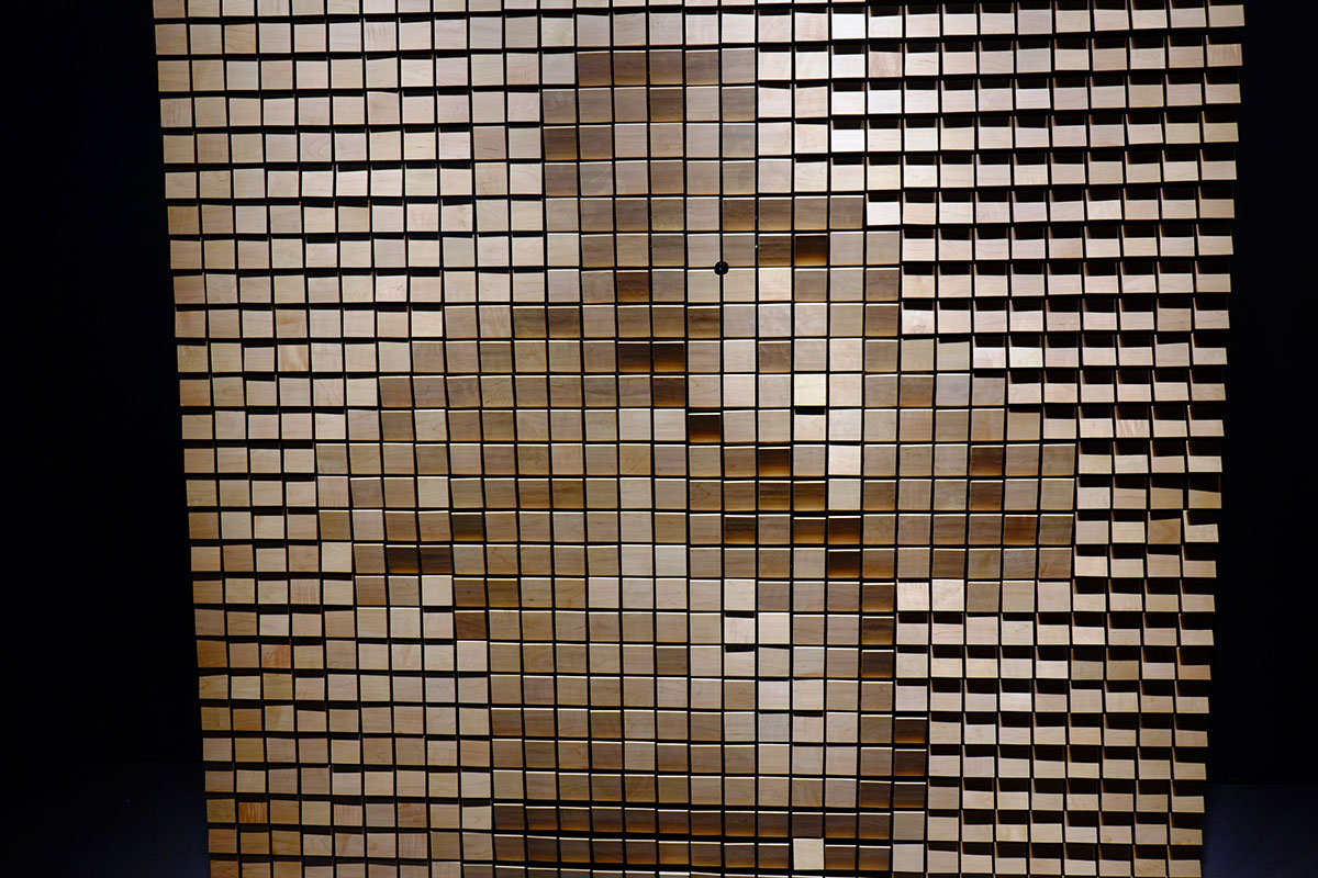 Meta- selfie at the Perot Museum.  A digital interface which converts a real-time image of you into tilting pixel-tiles.DSCF4329