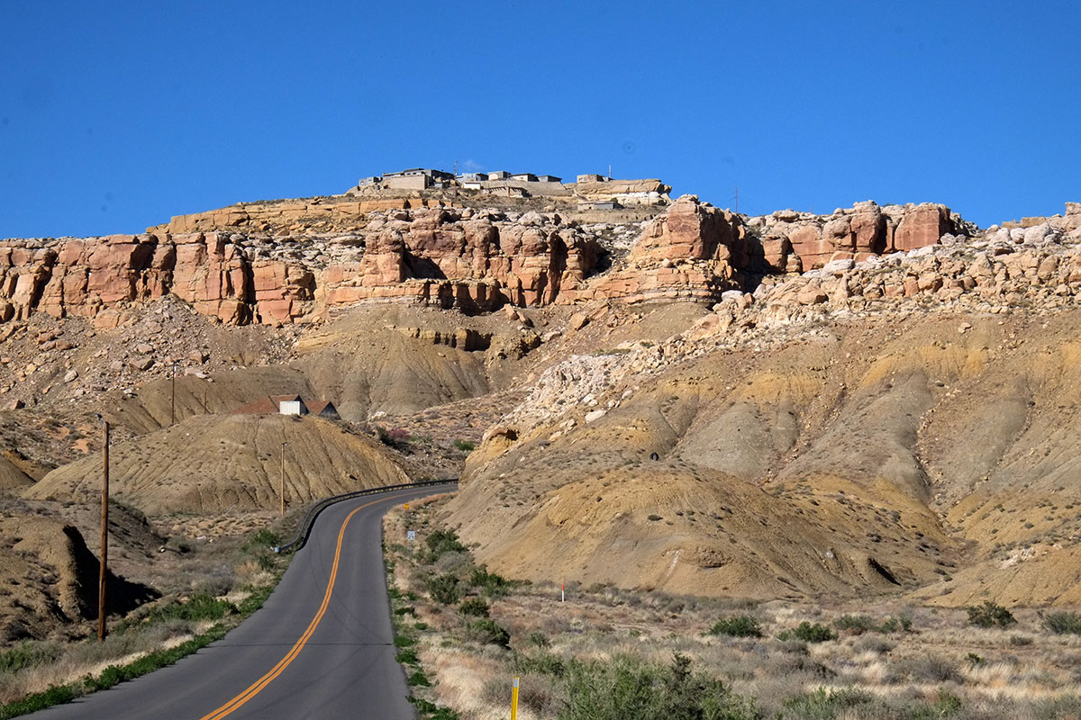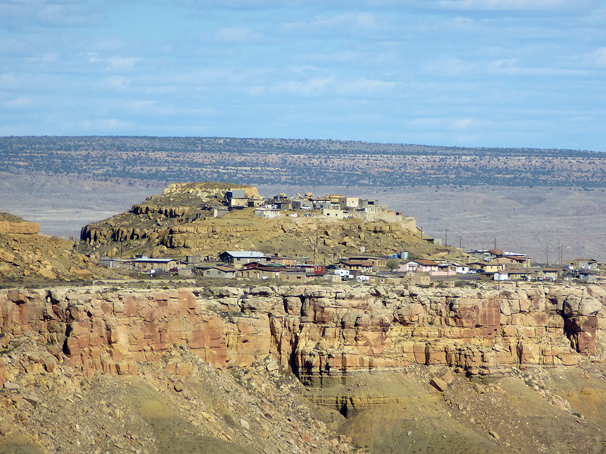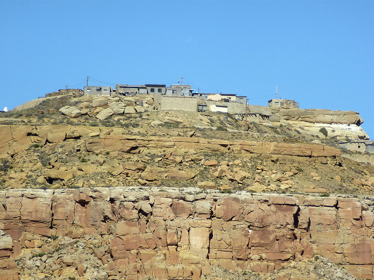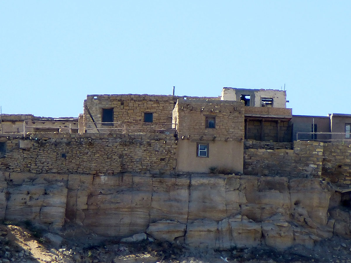 The Hopi reservation centers on the three mesas, (more accurately well-defined escarpments from one higher table land), completely surrounded by the Navajo reservation. The original villages were built on these mesas over 700 years ago, and have evolved over time – buildings come and go, and whole villages have disappeared too. The buildings are masonry, usually made from the local stone; when you look at one of the mesas from a distance, it is often hard to see where the native stone ends and the buildings begin, as here at First Mesa,