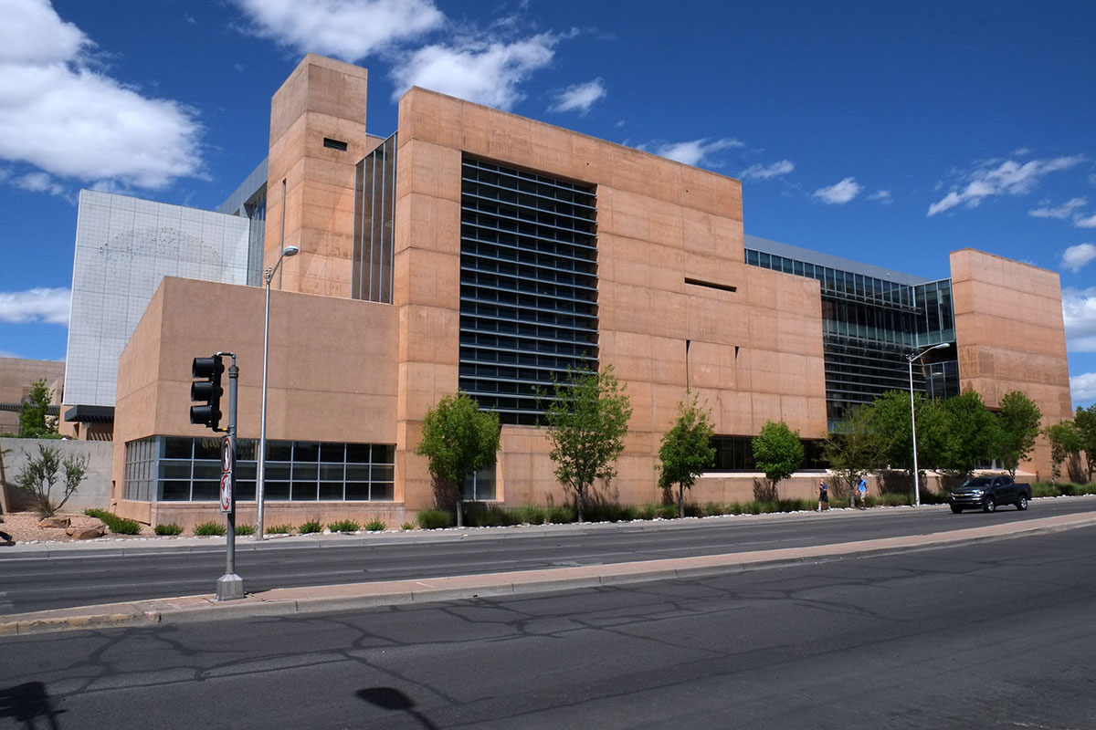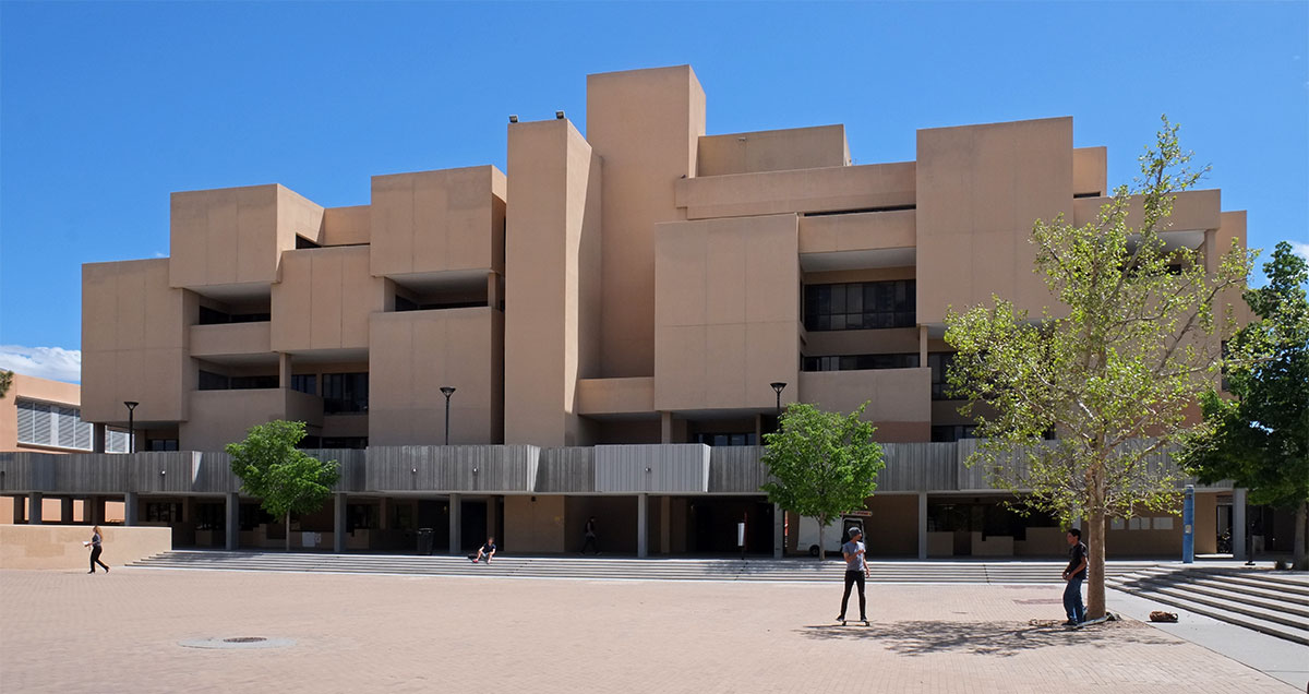 One of the best is the architecture building designed by Predock about ten years ago.  It sits on Route 66 on the edge of campus, with an exterior that combines solid wall areas reminiscent of the rest of campus, with well-shaded curtain walls.  97.Albuquerque012DSCF9357