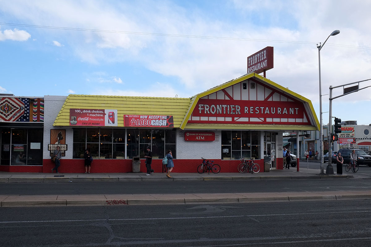 We were told by several of our informants in the local culture that the most important establishment in the city, the heart of Albuquerque, is the Frontier Restaurant.  It is located miles east of downtown on Central, right across from the UNM campus.  Open from early to late, it is the favored haunt of architecture students, and a wide range of locals.  97.Albuquerque015DSCF9690