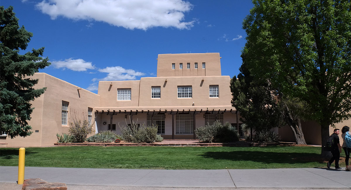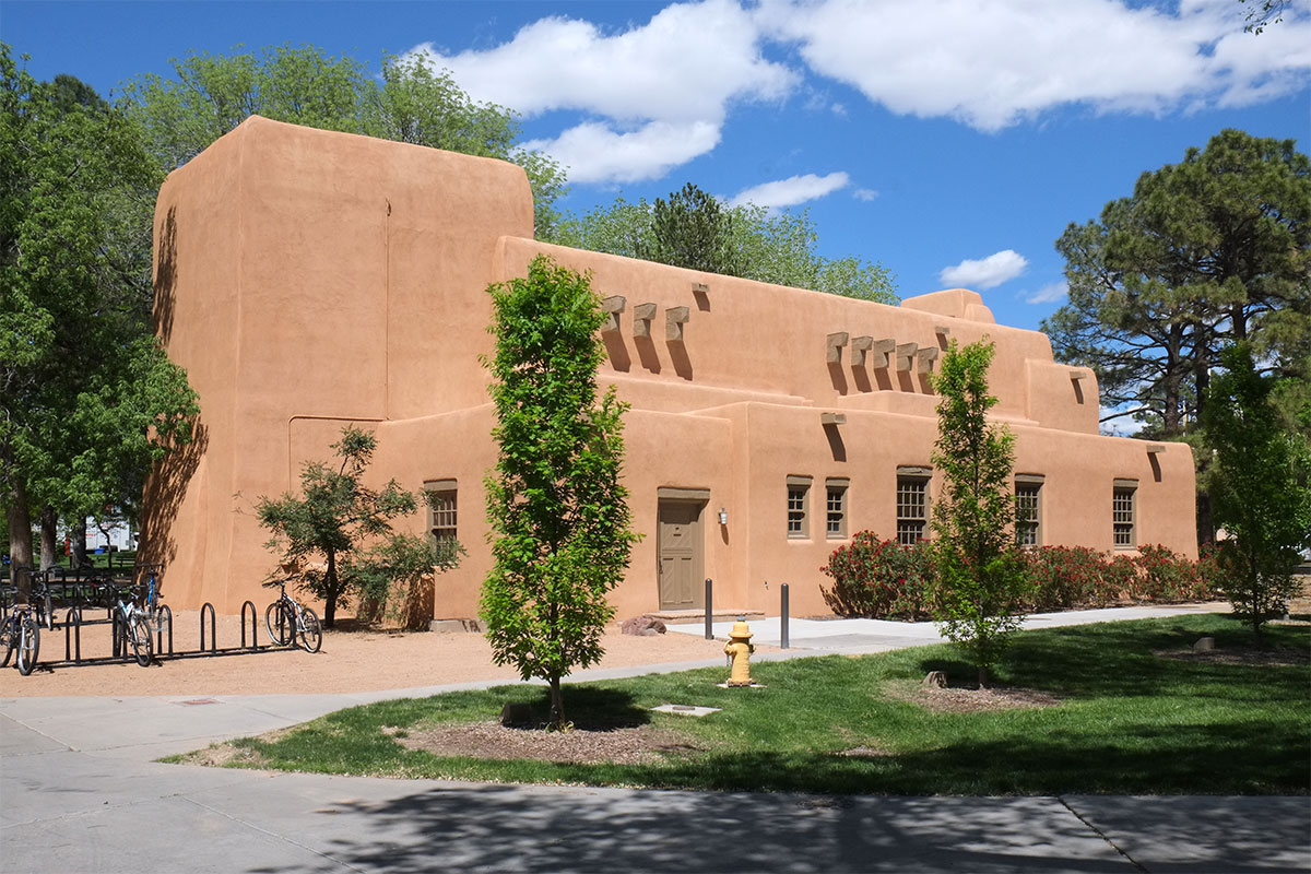 We spent some time on the University of New Mexico campus.  John Gaw Meem was the campus architect, and the dominant style is Pueblo Revival – beautiful solid buildings, which make more sense in this environment than glass boxes.  DSCF9375