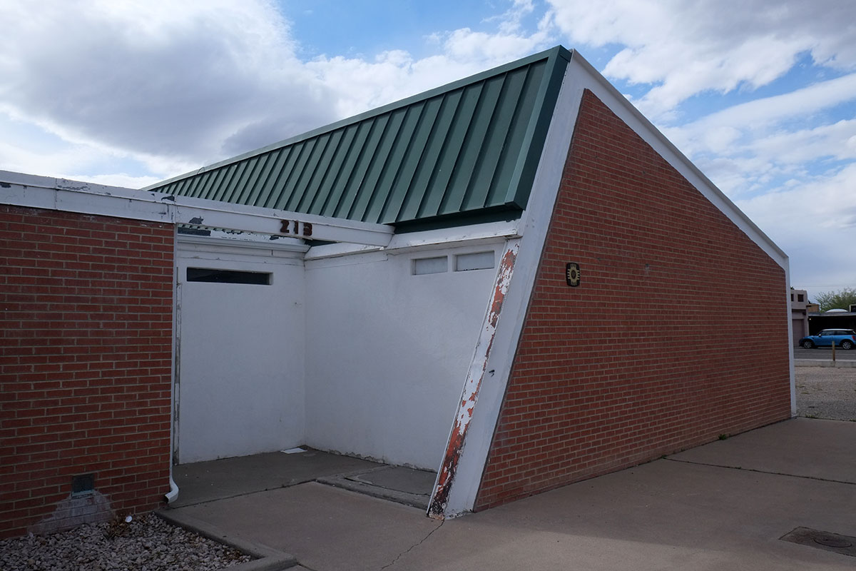 On the east side of town, we visited some excellent buildings.  This 1956 building is the first active-solar heated building in the world.  It was the office for Paxton and Bridgers, a local engineering firm.  Coincidentally, Frank Bridgers was my dad’s best friend in World War II, when they were both in the Army Corps of Engineers, stationed in Shanghai.  (Frank’s daughter Lynn was my pen pal when I was a little kid, and she provided me my first insights about life in Albuquerque.)   DSCF9441As I looked at this elegant building, I pondered the ironies of how careers develop.  Both Frank Bridgers and my dad were smart young engineers, starting their firms after the war, responding to the trends in development that would provide professional work.  As a mechanical engineer in the desert, Frank thought about the extremes of the environment and pioneered solar design, while my dad was a civil engineer who started his firm in the booming northeast, and designed some of the earliest shopping centers and malls.  My dad and I sometimes talked about what had happened.  As he said, suburban growth looked like a positive thing in the 1950s, when it was still very limited.  In hindsight, it’s clear that such a development type wasn’t going to scale up very well without causing big problems, but that wasn’t apparent to many people at the time.